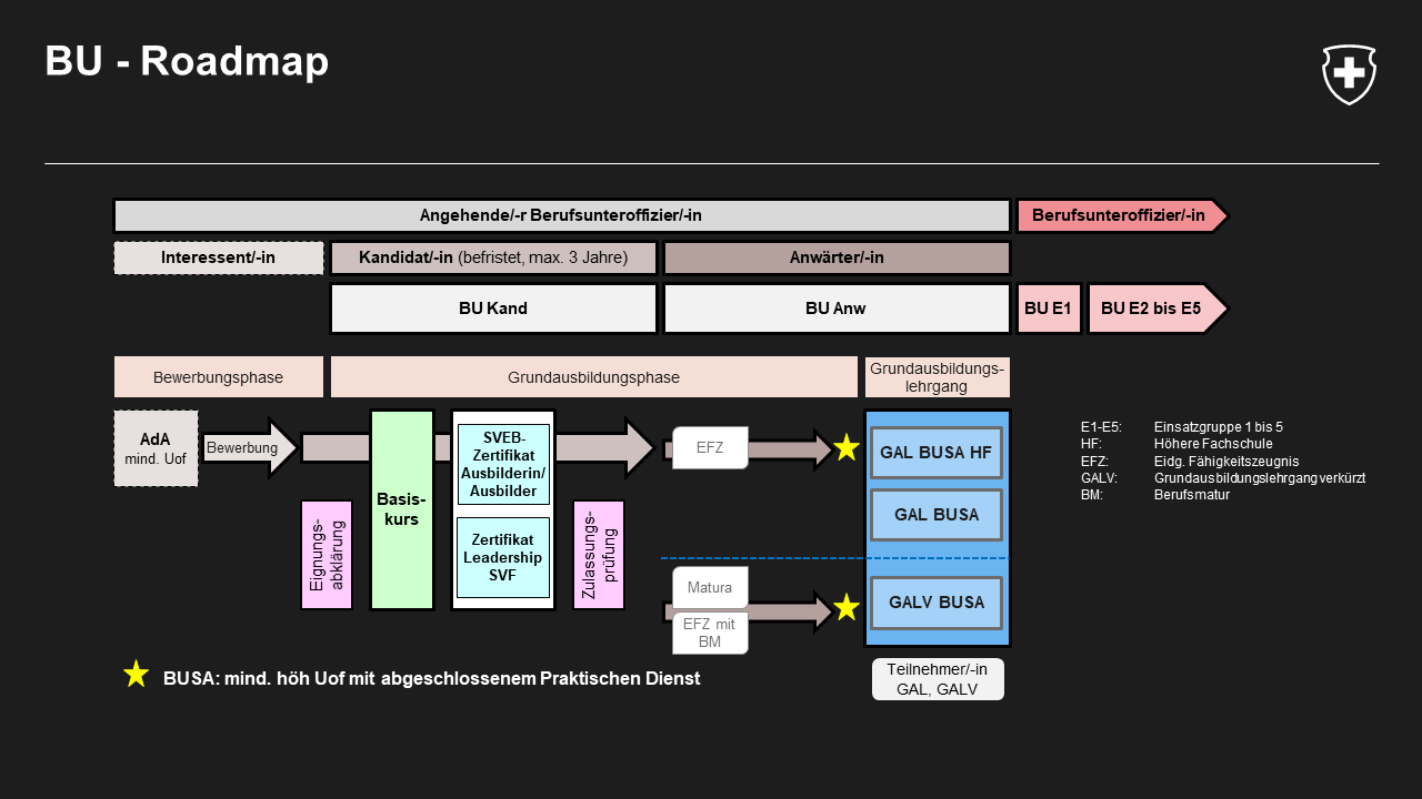 2-jähriger Grundausbildungslehrgang (GAL) mit Abschluss zum eidgenössisch diplomierten Berufsunteroffizier/-in HF.