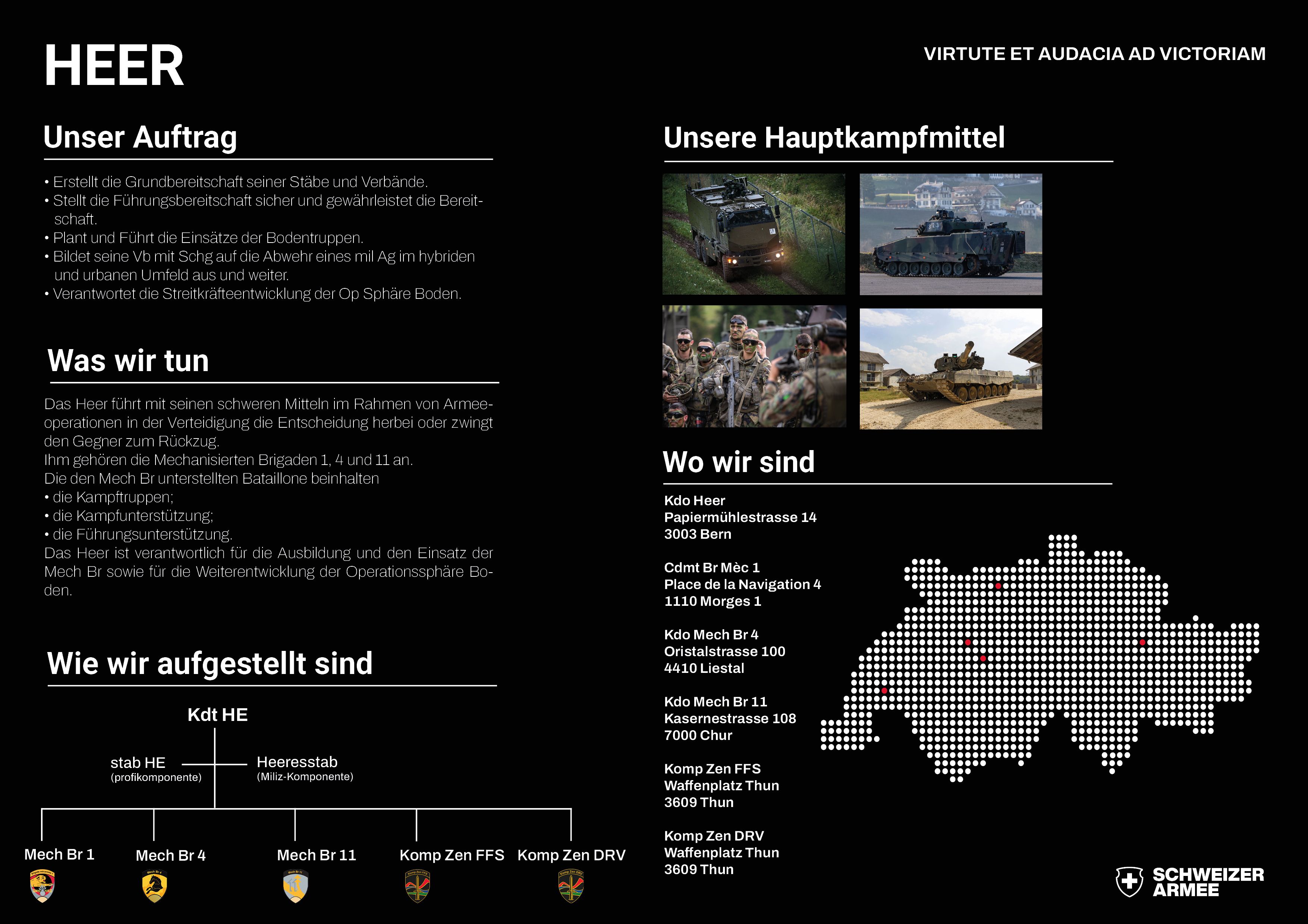 Das Heer ist Teil der Schweizer Armee. Ihm gehören die Mechanisierten Brigaden 1, 4 und 11 an. Die den Mechanisierten Brigaden unterstellten Abteilungen und Bataillone beinhalten die Kampftruppen, die Kampfunterstützung und die Führungsunterstützung. Das Heer ist verantwortlich für die Ausbildung der Mechanisierten Brigaden sowie für die Weiterentwicklung der Operationssphäre Boden.