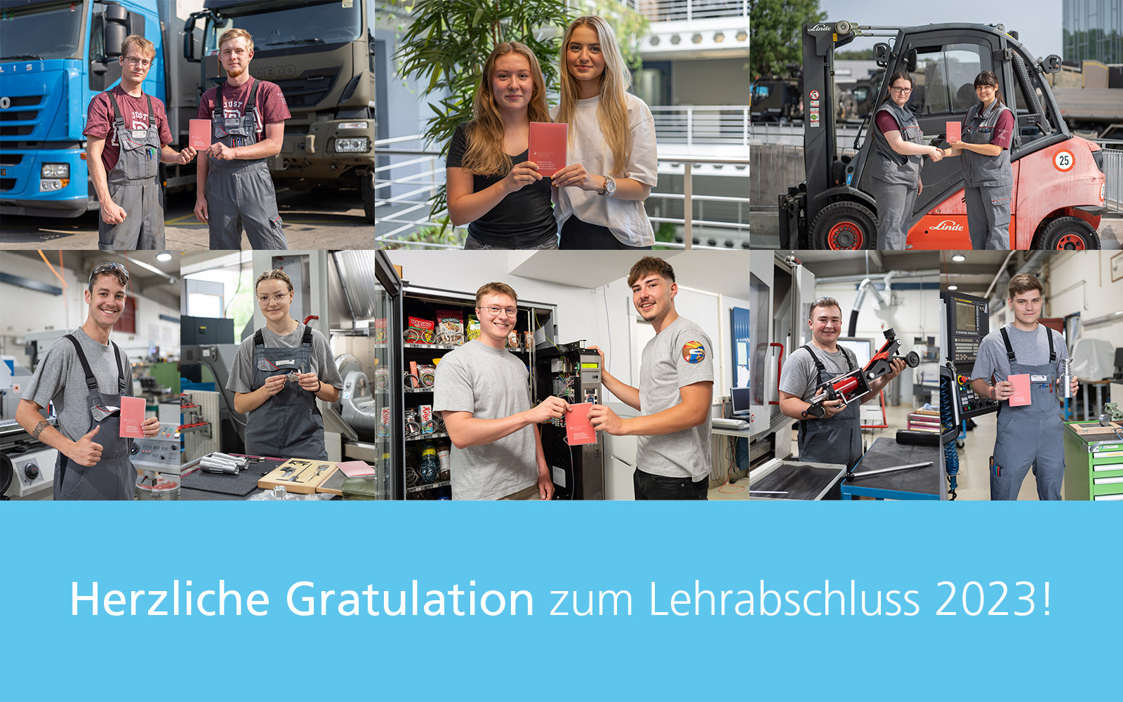 Wir gratulieren unseren Lernenden herzlich zum erfolgreichen Lehrabschluss 2023. Vielen Dank für die geleistete Arbeit und euer Engagement während der Ausbildungszeit.