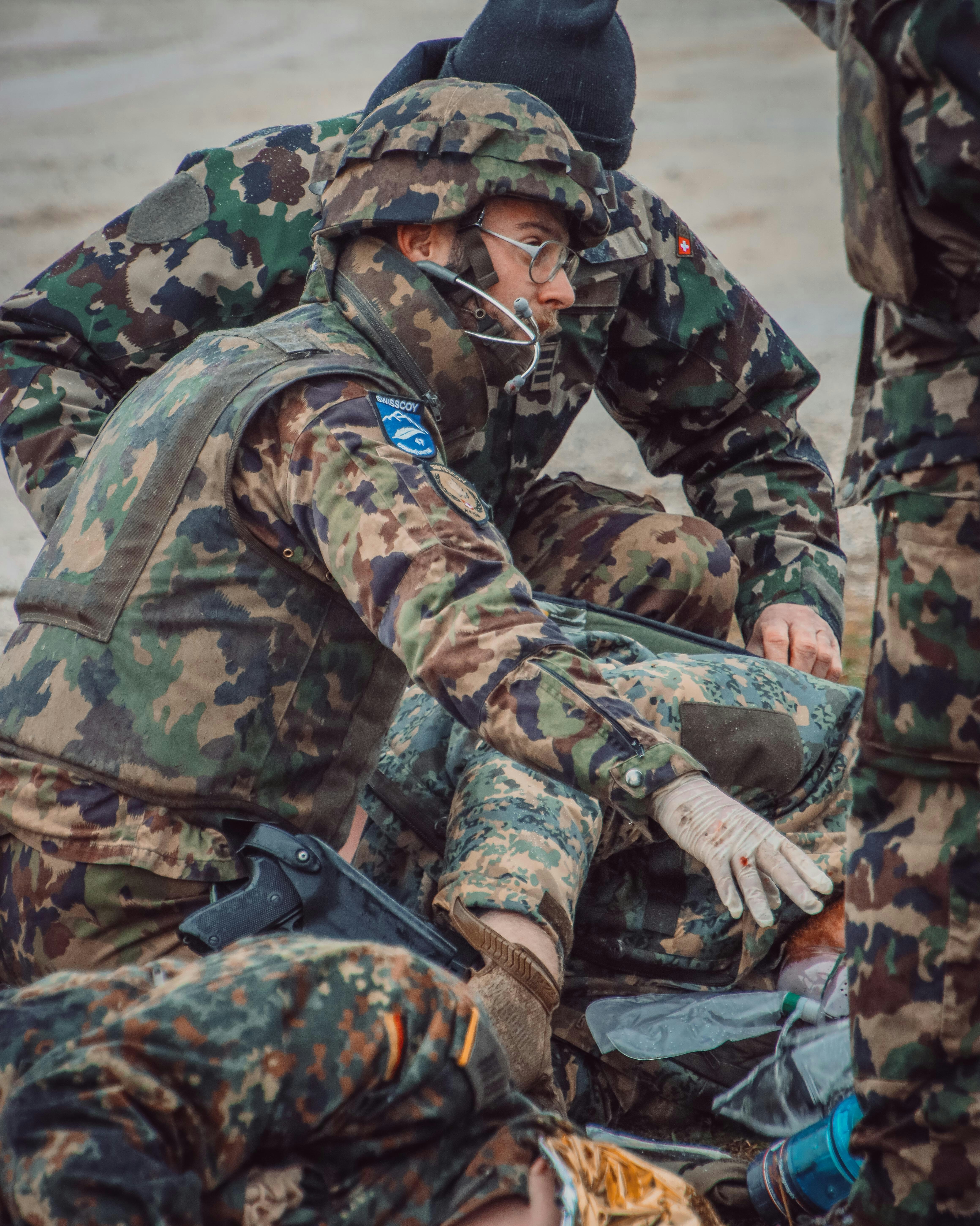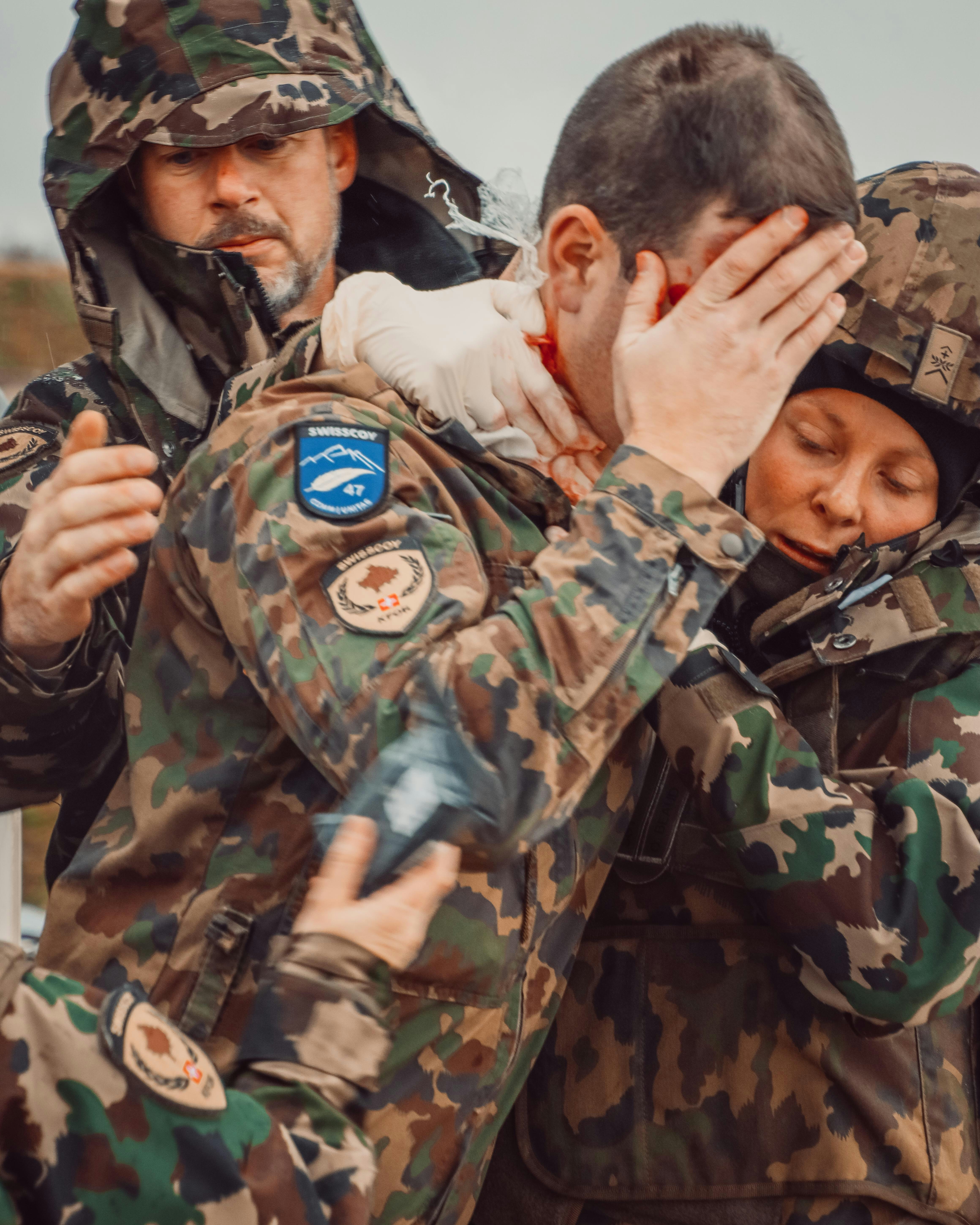 Vom Camp verschieben die Medics zur inszenierten Unfallstelle. Das Szenario für die MedEvac ist ein Busunfall. Jetzt heisst es: die Situation analysieren und die Aufgaben teilen. "In so einem Fall muss man einfach funktionieren – als Person und auch als Team. Jedes Teammitglied muss wissen was er oder sie zu tun hat und jede und jeder muss seine Rolle kennen", sagt Obwm Pernet. So übernimmt die Chief Nurse das Kommando und für den Rest des Teams heisst es: bergen, den Zustand der Patienten analysieren und erste Hilfe leisten. Obwohl das Medic-Team erst seit ein paar Monaten zusammenarbeitet und jeder einen anderen Rucksack in den Einsatz mitgebracht hat funktioniert alles wie am Schnürchen. Blutende Wunden werden versorgt, Tourniquets montiert und jene Patienten die nicht mehr gehen könne, werden transportfähig gemacht.