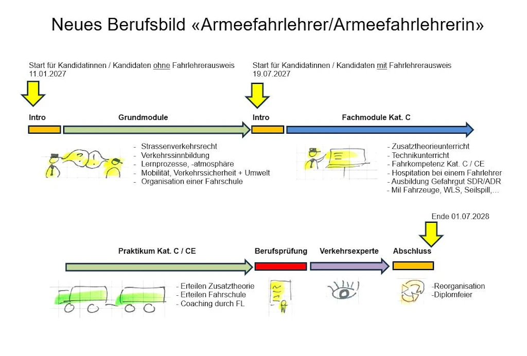 - Durchführung von anerkannten Fahrlehrerberufsschulen Kat C und die gesetzlich festgelegten Weiterbildungen für die Armeefahrlehrer.