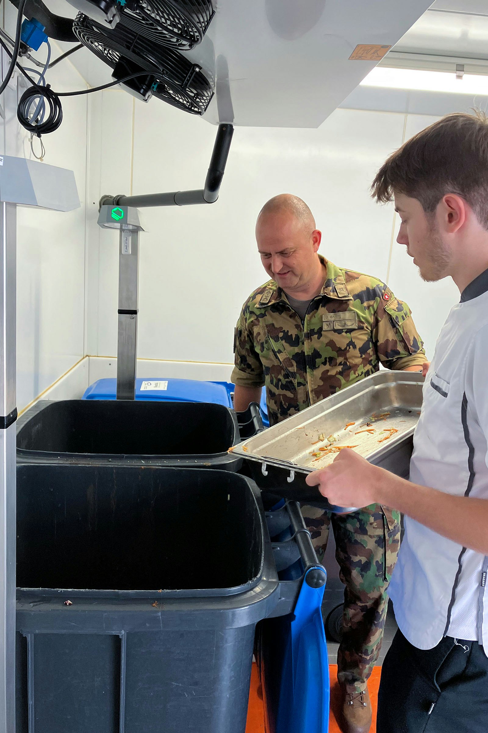 Um die Lebensmittelresten in den Truppenküchen detailliert erfassen zu können, hat sich Daniel Marti an das Start-up-Unternehmen Kitro gewandt. Dessen hochmoderne Tools zur Messung und Überwachung von Lebensmittelabfällen werden nun während des ganzen Jahres 2023 in der Kaserne Brugg (AG) eingesetzt. Die Technologie von Kitro besteht aus Waagen und Kameras, mit denen jedes weggeworfene Lebensmittel erkannt und erfasst wird. Auf diese Weise kann ermittelt werden, welche Arten von Lebensmitteln und welche Mengen täglich weggeworfen werden. Dies ist der Schlüssel zu Anpassungen und Verbesserungen. «Nur aus Fehlern lernt man», betont Hptadj Marti bezugnehmend auf die Schwierigkeiten, die jeder neue Küchenchef und jede neue Küchenchefin hat, wenn er oder sie die Bestellungen für Rekruten- und Unteroffiziersschulen tätigen muss.