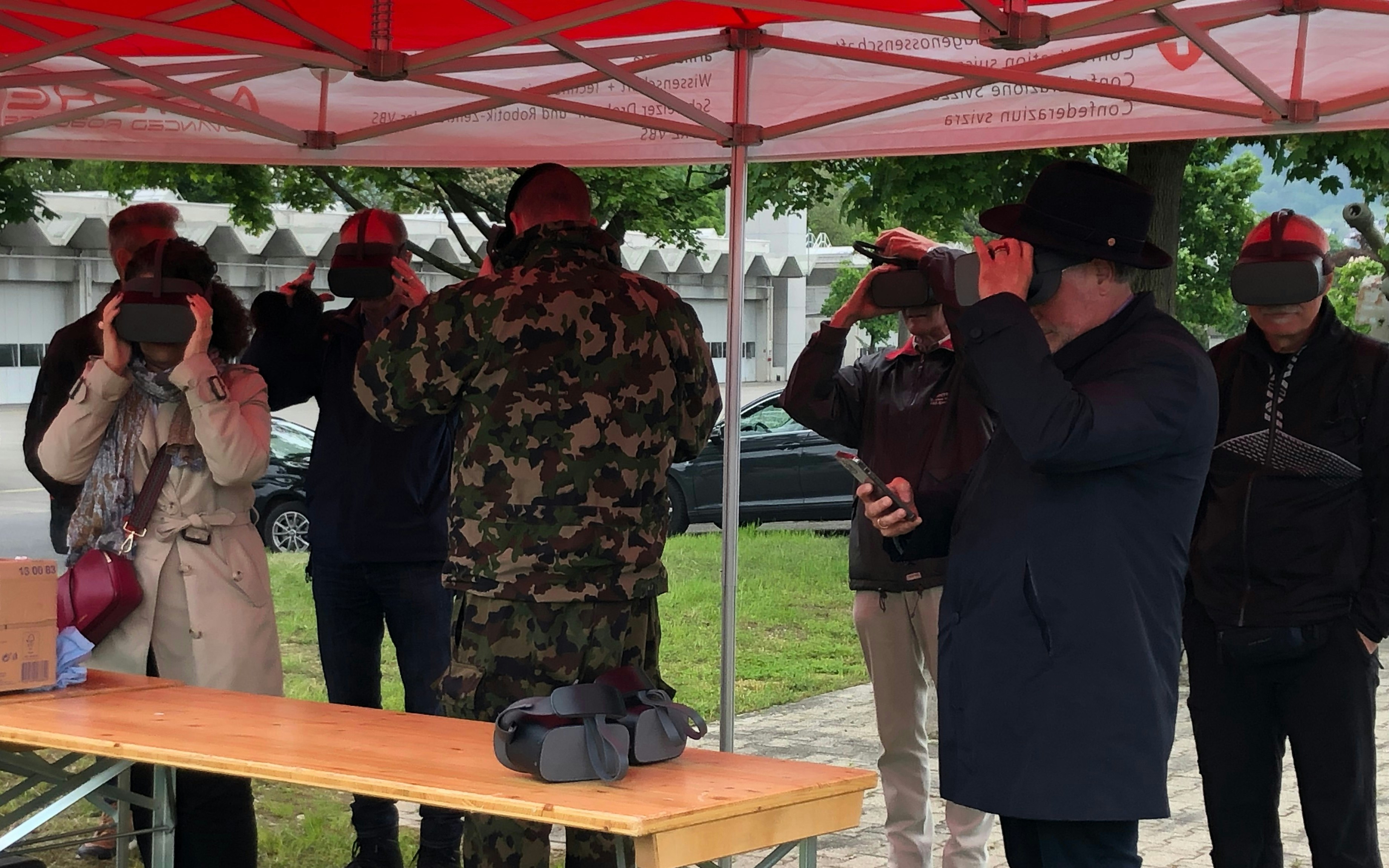 Im elektronischen Taktiksimulator übten sich die Besuchergruppen, angeleitet von Offiziers-Aspirantinnen und -Aspiranten, im Gefecht im virtuellen Gelände. Beim «Sandkasten» einem nachgebauten Dorf mit Strassen- und Wald- Umgebung, ging’s um die korrekten Gefechtsanweisungen und ein verständliches Meldeschema. Mit Virtual Reality-Brillen konnten sich die Besucherinnen und Besucher im Panzerfahren üben. Einige hatten auch die Gelegenheit, einen Panzerverschiebung direkt zu erleben: Helm auf.