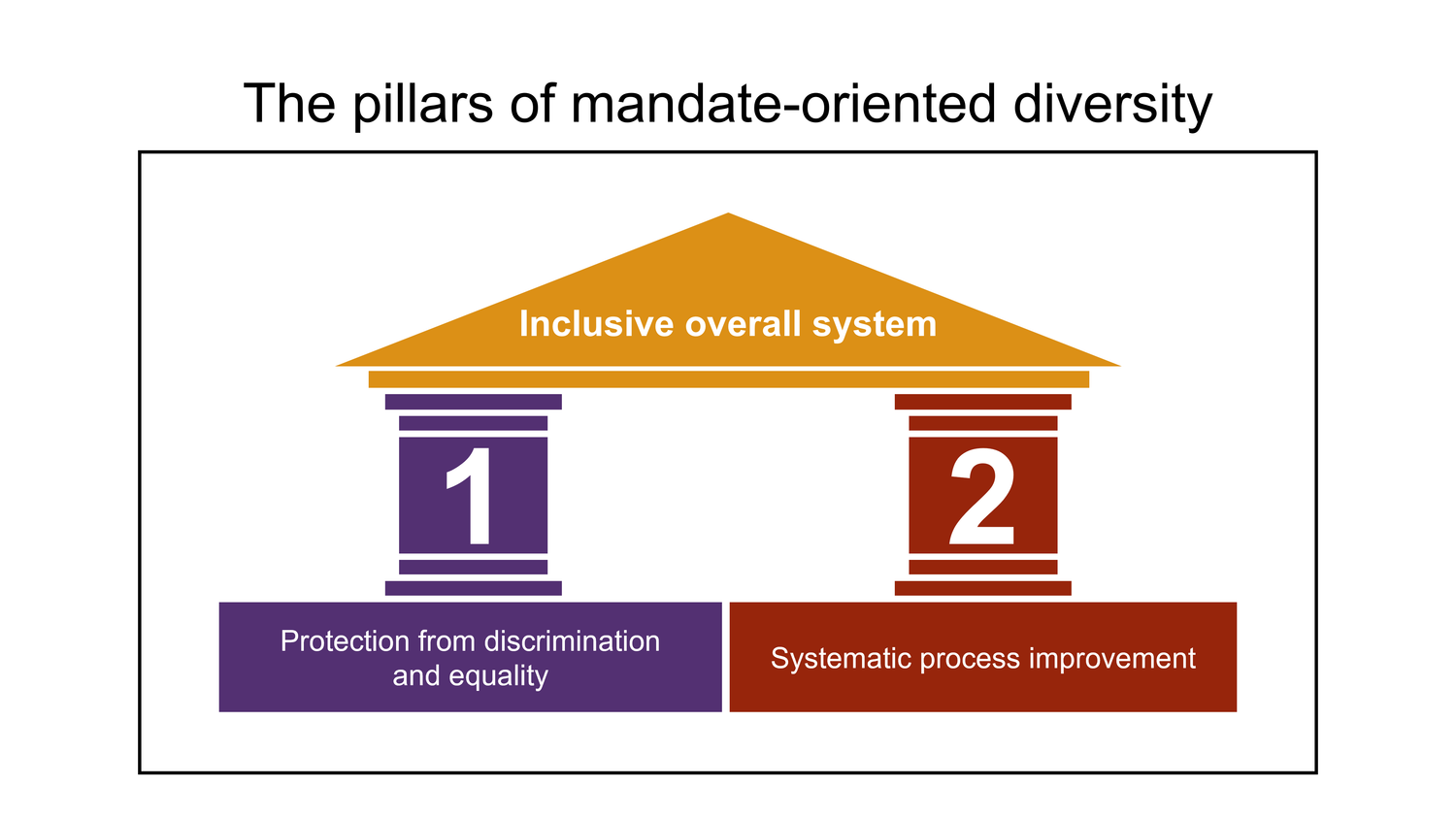 Using diversity in a beneficial way requires to open up ones thinking and understanding and to consciously apply this change to all processes and structures in the overall organisation. This allows for conscious decisions about where and how much diversity is appropriate, ensuring that it does not lead to a decrease in the fulfillment of the mandates. The goal is to have objective justifications on where inclusions and exclusions occur.