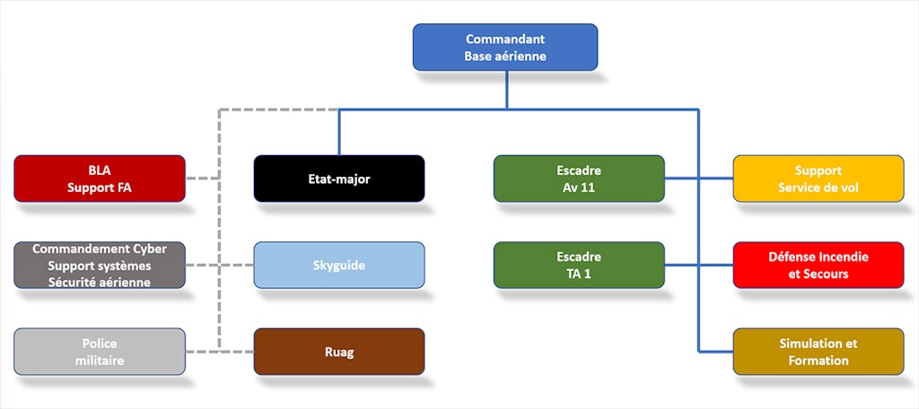Pour remplir ses missions, la Base aérienne s'appuie sur d'autres organisations de la Défense et sur des entreprises externes mandatées, notamment :