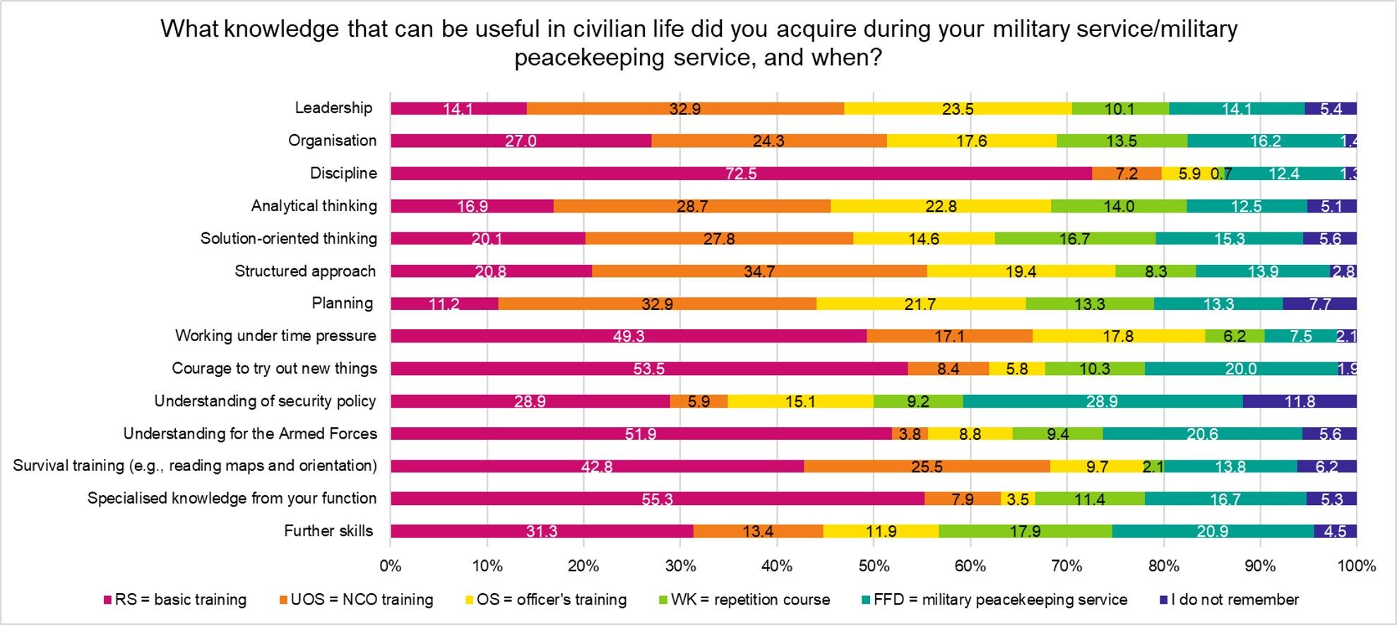 During basic military training, the first step in military life, many experiences are had and skills acquired that can also be useful in civilian life, for example, discipline, courage, trying out new things, working under time pressure, understanding of the Armed Forces and survival training. Certain skills are primarily acquired in leadership training programmes, such as leadership itself, analytical thinking, structured approaches, and planning ability (see Figure 2).