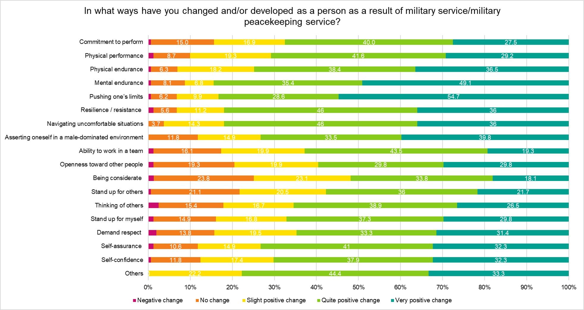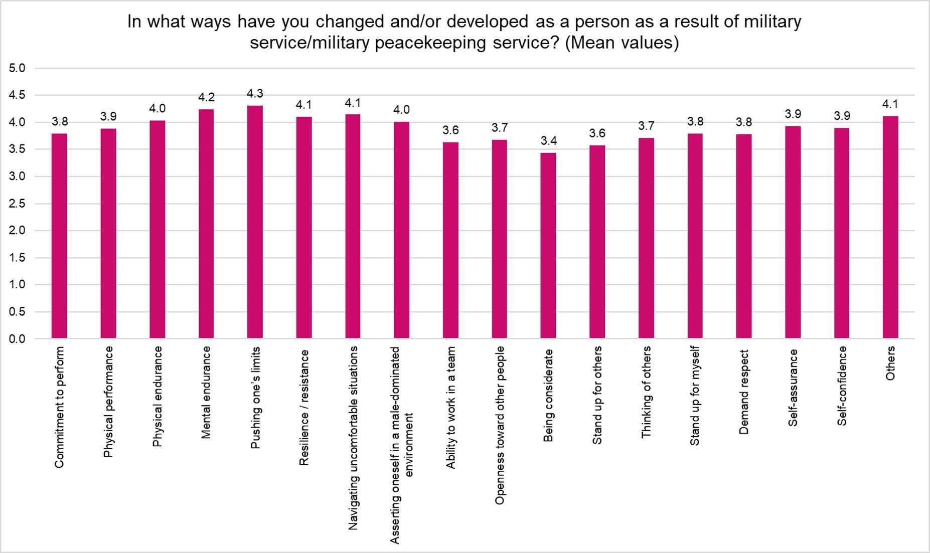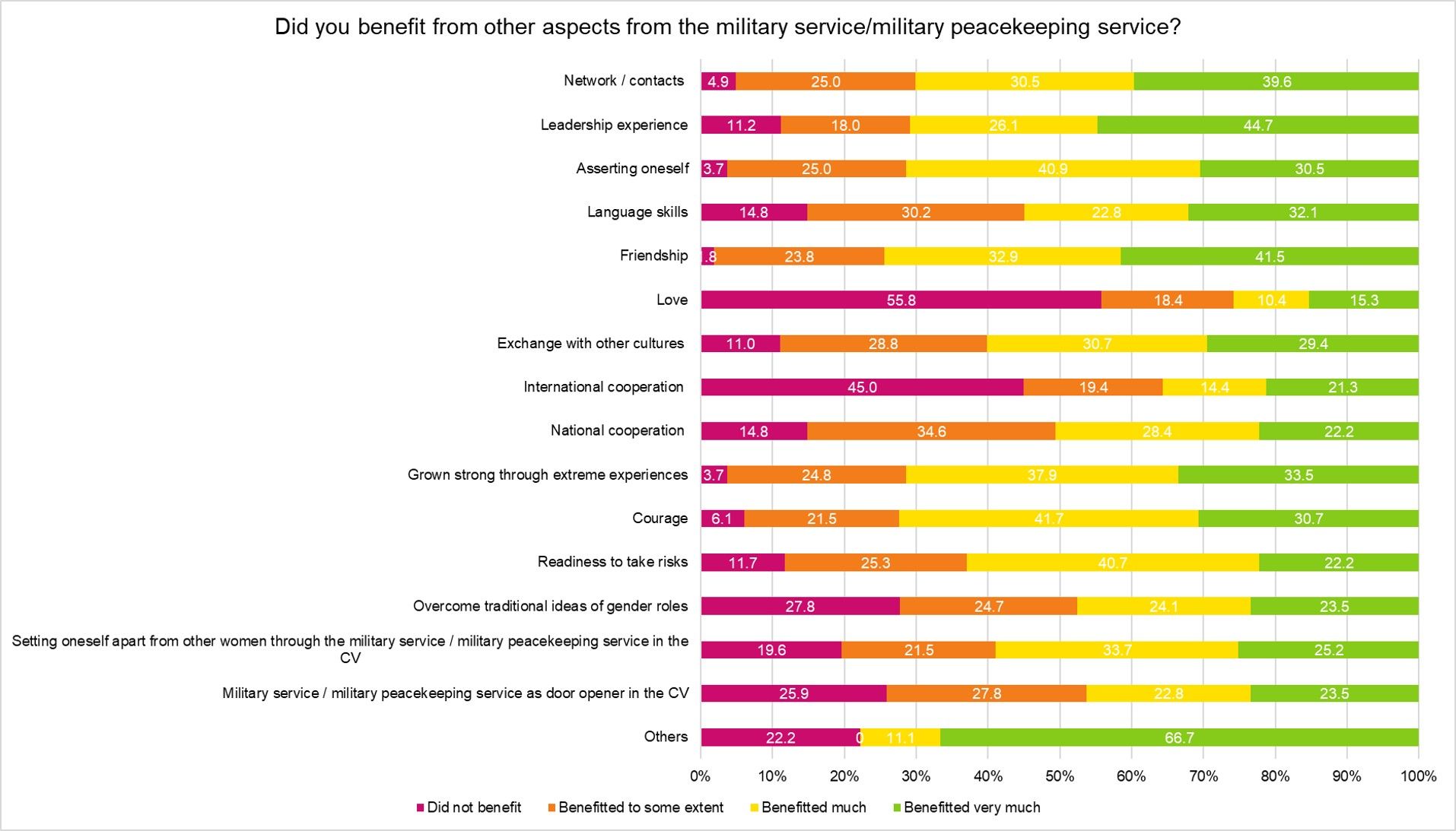 The other aspects from which the participants were able to benefit during their military service/military peacekeeping service show differences in the mean values. These are always in the range between 2 (partly benefited) and 3 (benefited a lot) on a scale of 1 to 4 (did not benefit; benefited a lot) (see Figure 5). Here, too, a closer look at the distribution shows that the aspects were rated very differently (see Figure 6).