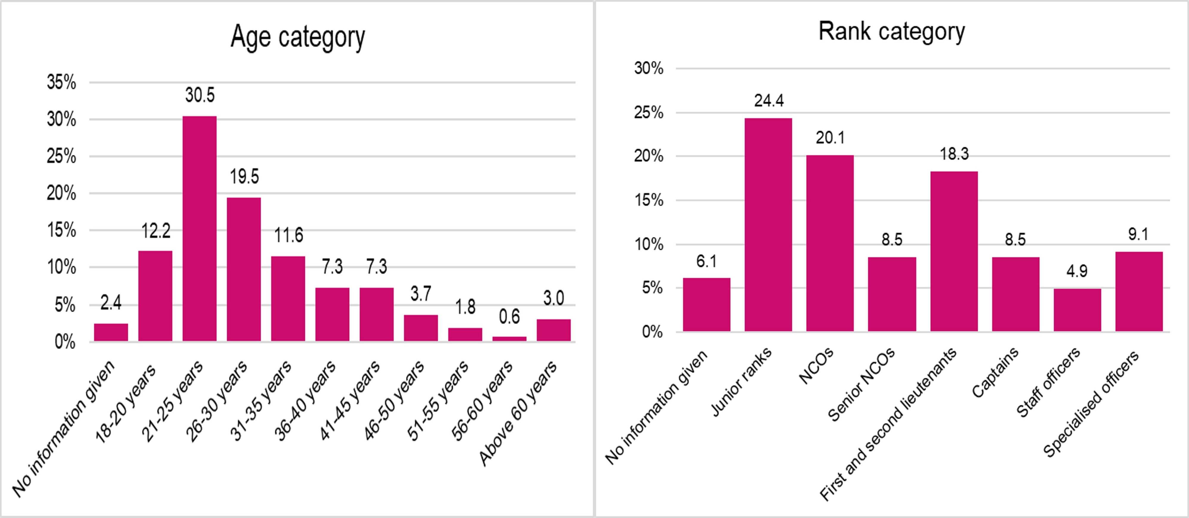 The questionnaire was addressed to Swiss women who had done military service or military peacekeeping service. A total of 164 women aged between 18 and over 60 took part in the study, divided into the various military rank categories from private to colonel.