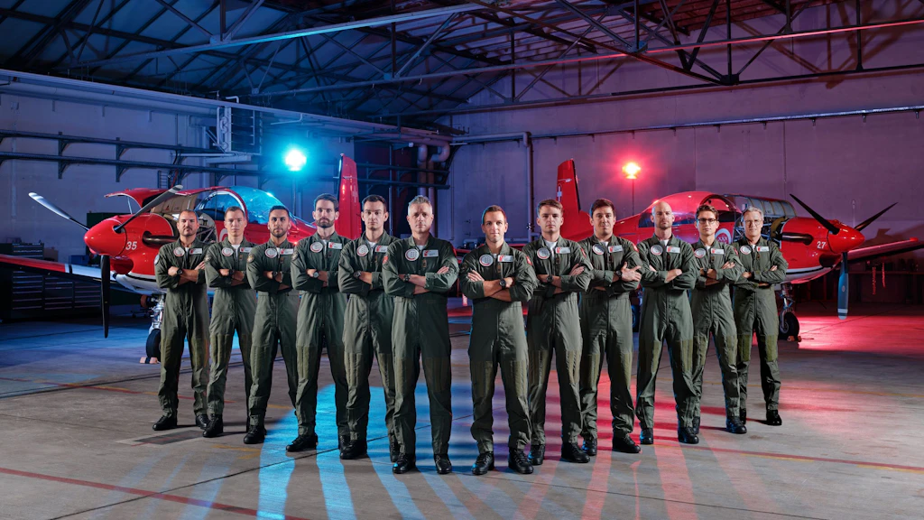 Formation aerobatics performed in propeller planes are highly challenging even for proficient military pilots. Therefore, all team members are pilots from the Air Force's Professional Aviator Corps who normally fly the F/A-18 Hornet, helping to fulfil the air force's mission of safeguarding air sovereignty and carrying out air policing missions in Swiss airspace.