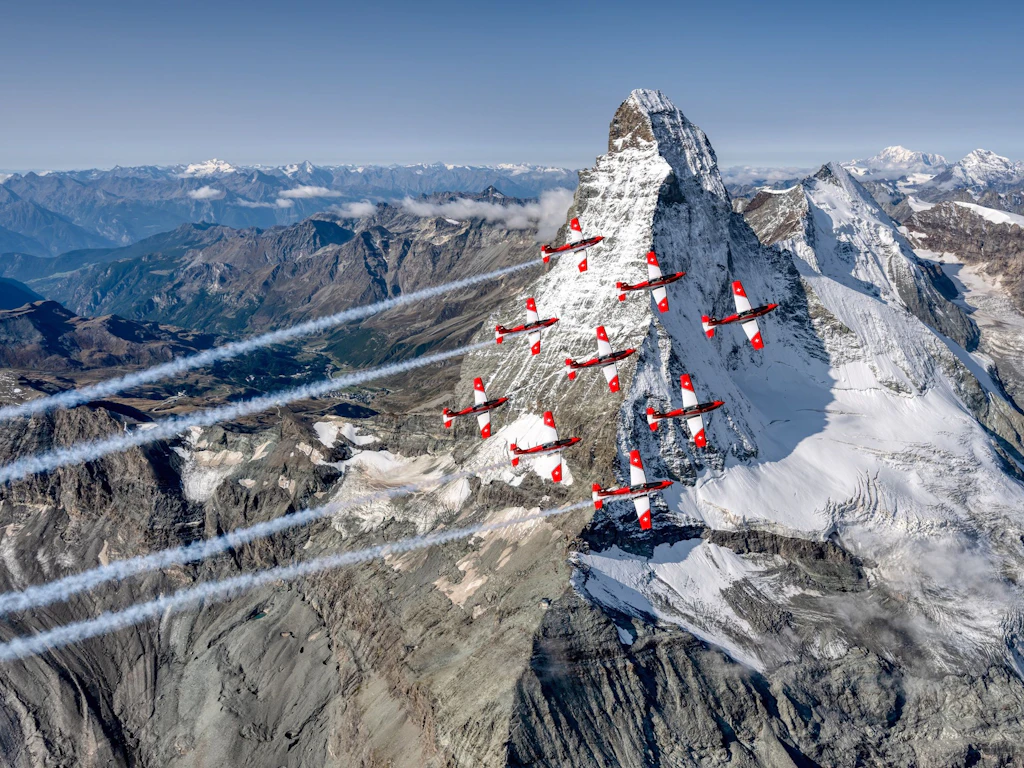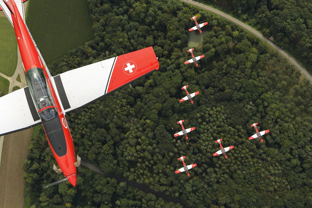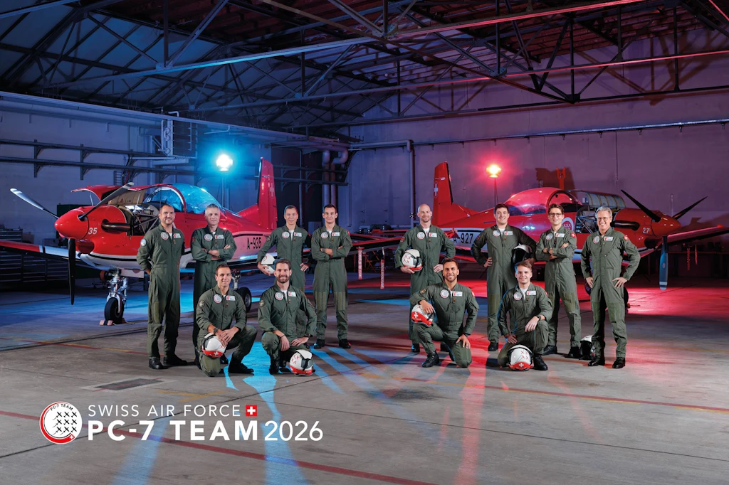 The PC-7 TEAM showcases the high level of training and performance of both the Swiss Armed Forces and the Swiss Air Force by flying dynamic, elegant and precise manoeuvres. With their culture of commitment and discipline, the pilots prove to the public that they master the challenges of top-level military flying. Flight safety and teamwork are top priorities during the professional displays by the PC-7 TEAM, which are characterised by clear flight paths, attractive formation changes and varied manoeuvres. It is therefore no surprise that the team with its nine Pilatus PC-7 trainers enthrals tens of thousands of spectators every year and is highly regarded at home and abroad.