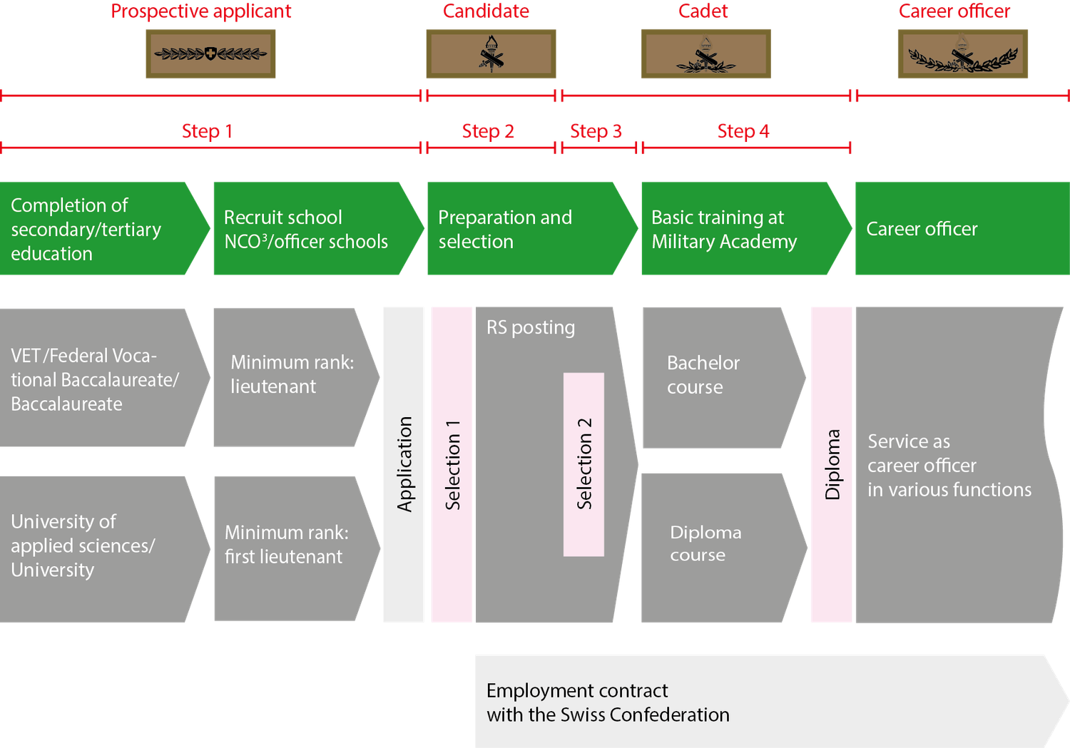 Depending on prior education, two different basic training courses are available for future career officers of the Swiss Armed Forces.