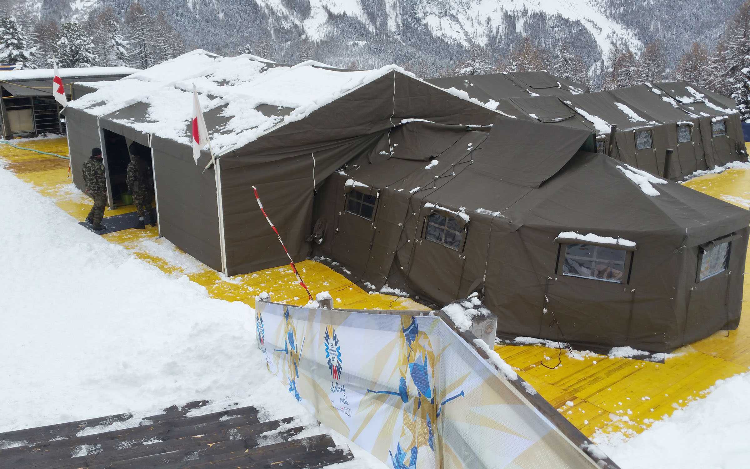 Un premier hôpital de campagne a été mis en place en proximité des tribunes, et a déjà été en mesure d'offrir ses services aux différents collaborateurs qui, dans le cadre de la préparation des pistes, ont fait la demande. Un deuxième hôpital a trouvé place dans le village, auprès de la vieille Poste. Avec le poste sanitaire présente sur la Medal Plaza, l'armée peut garantir des soins à 300 personnes simultanément. La troupe est en mesure de fournir ses services à plus de 600 personnes - dont 120 dans un état grave - dans les deux prochaines semaines, mais ils sont aussi prêts à augmenter de manière significative leur capacité pour faire face à des événements majeurs.