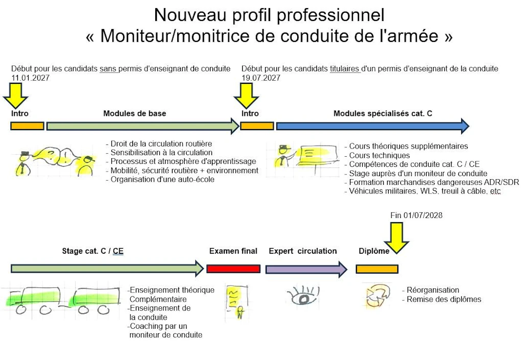 - Dispenser la formation et le perfectionnement du personnel enseignant engagé à l’instruction à la conduite (experts militaires de la circulation, chefs Circulation et transport des écoles).