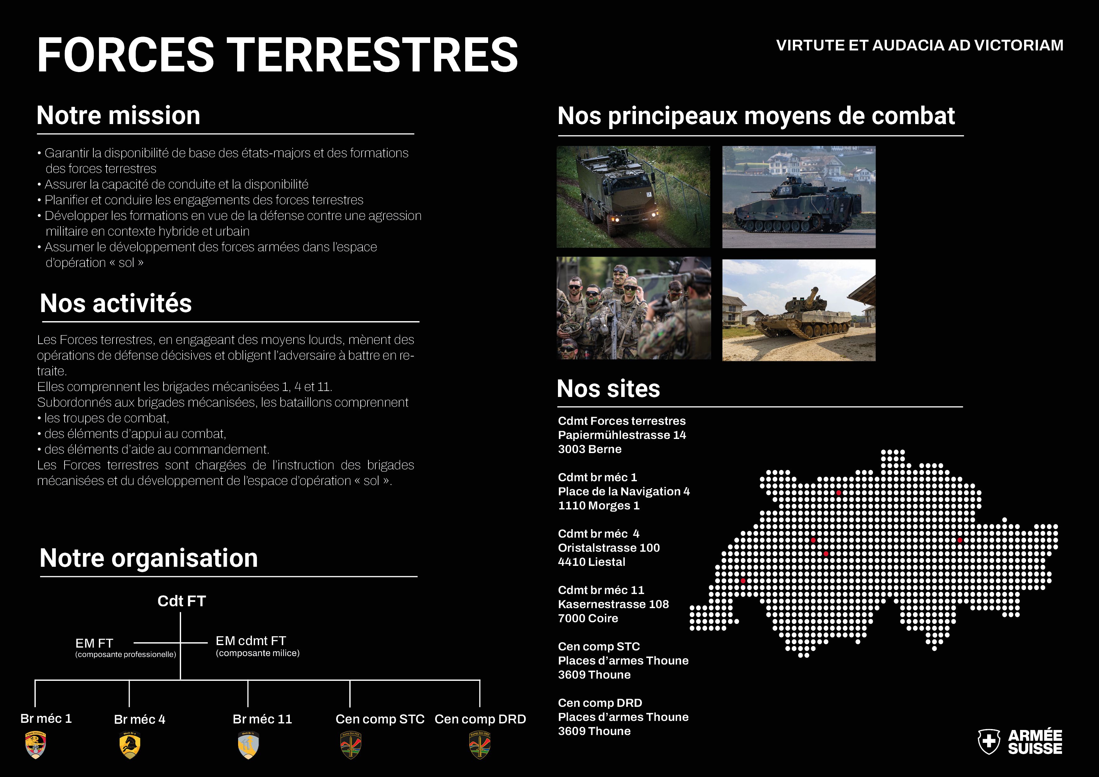 Les Forces terrestres font partie de l’Armée suisse. Elles comprennent les brigades mécanisées 1, 4 et 11. Les bataillons subordonnés aux brigades mécanisées comptent des troupes de combat et des éléments d’appui au combat et d’aide au commandement. Les Forces terrestres sont responsables de l’instruction des brigades mécanisées et du développement de la sphère opérationnelle « sol ».