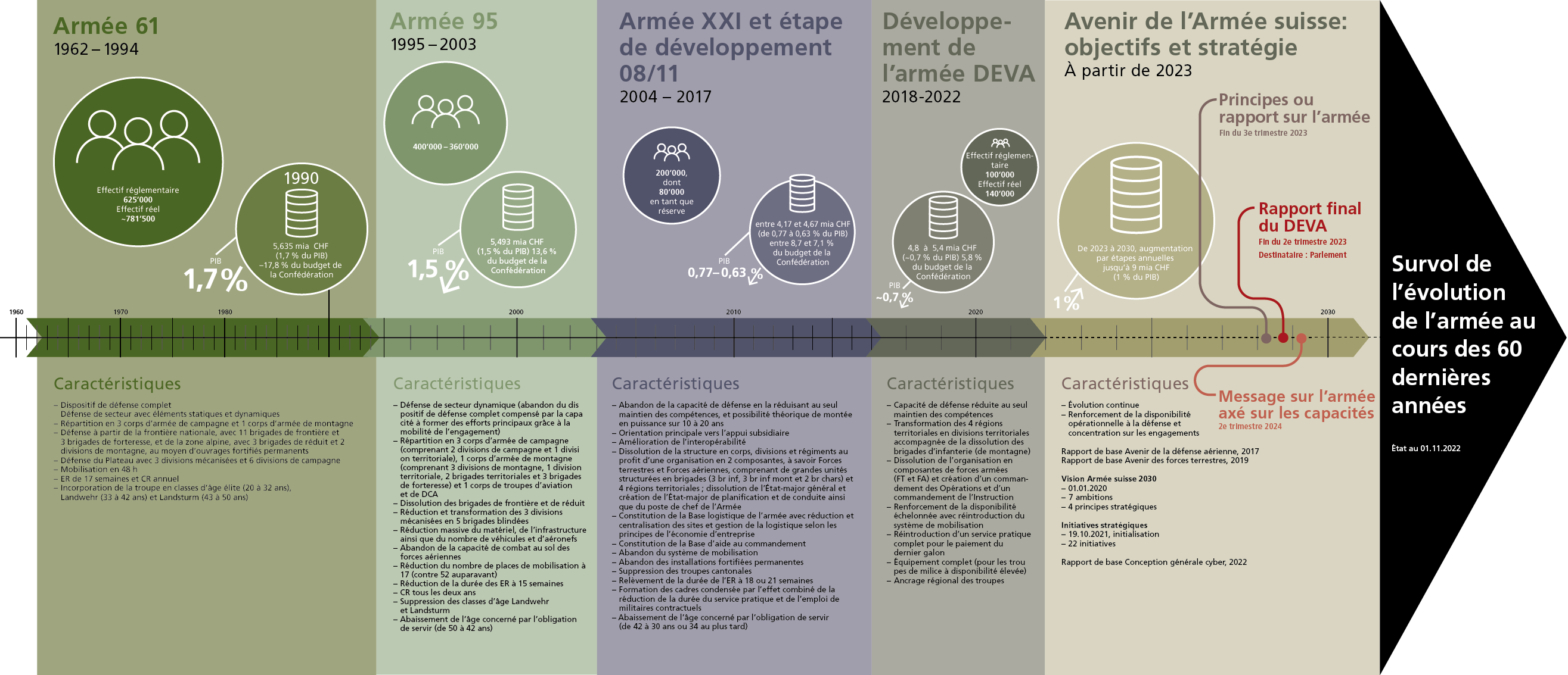 Le DEVA est remplacé par la vision de l’Armée suisse complétée par les initiatives stratégiques : le rapport Renforcer la capacité de défense et les trois rapports de base (Avenir de la défense aérienne et des forces terrestres et Conception générale cyber).