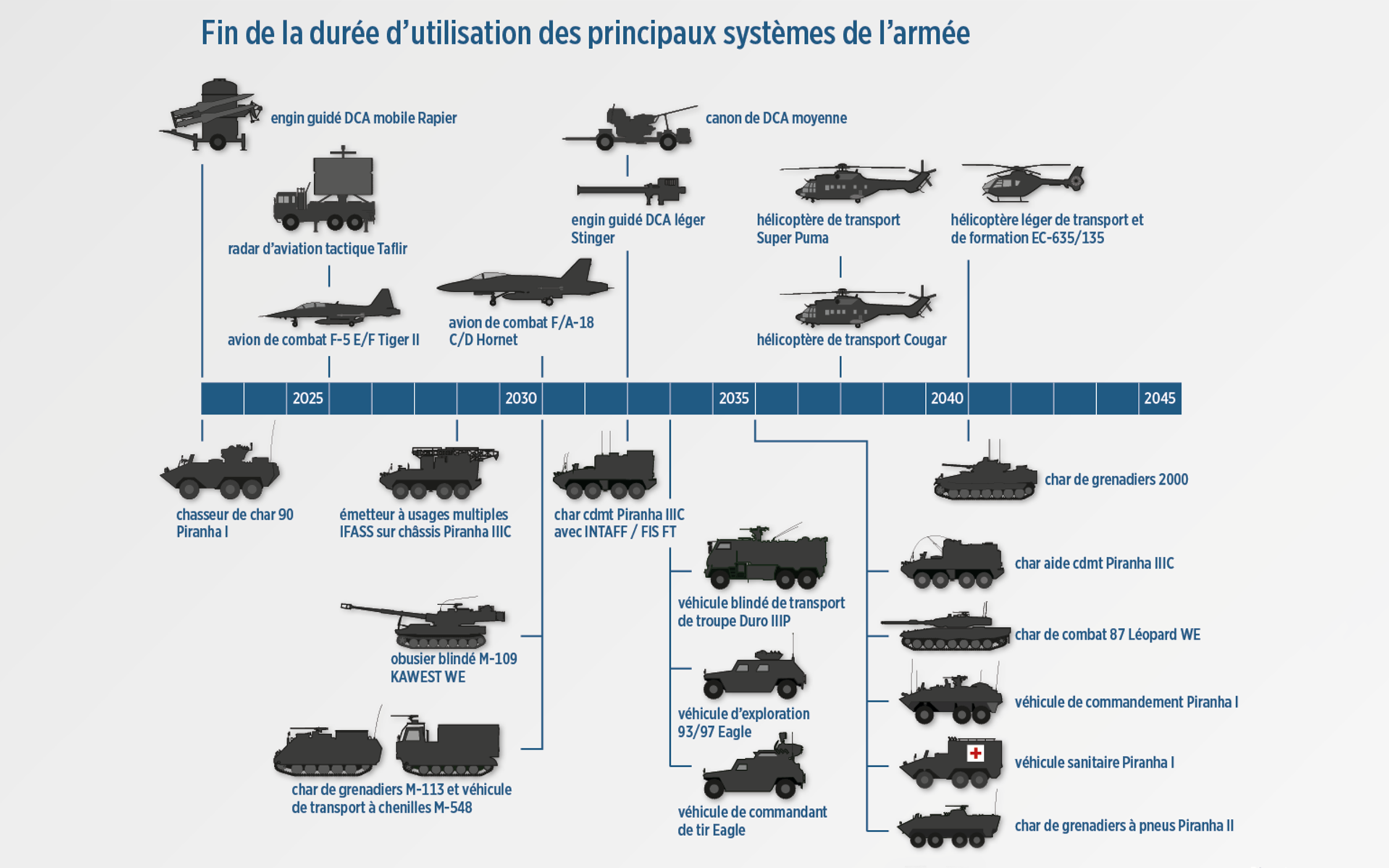 La modernisation et le renouvellement de l’armée coûteront plus de 40 milliards de francs financés par le budget ordinaire de l’armée. Le nouvel avion de combat F-35 et le nouveau système de défense sol-air de longue portée Patriot sont compris dans ces coûts. Avec ces deux systèmes, l’armée a commencé à renforcer sur le long terme sa capacité de défense. Cependant elle doit remplacer dans les vingt prochaines années au total 24 systèmes principaux qui ont atteint la fin de leur durée d’utilisation (voir le graphique).