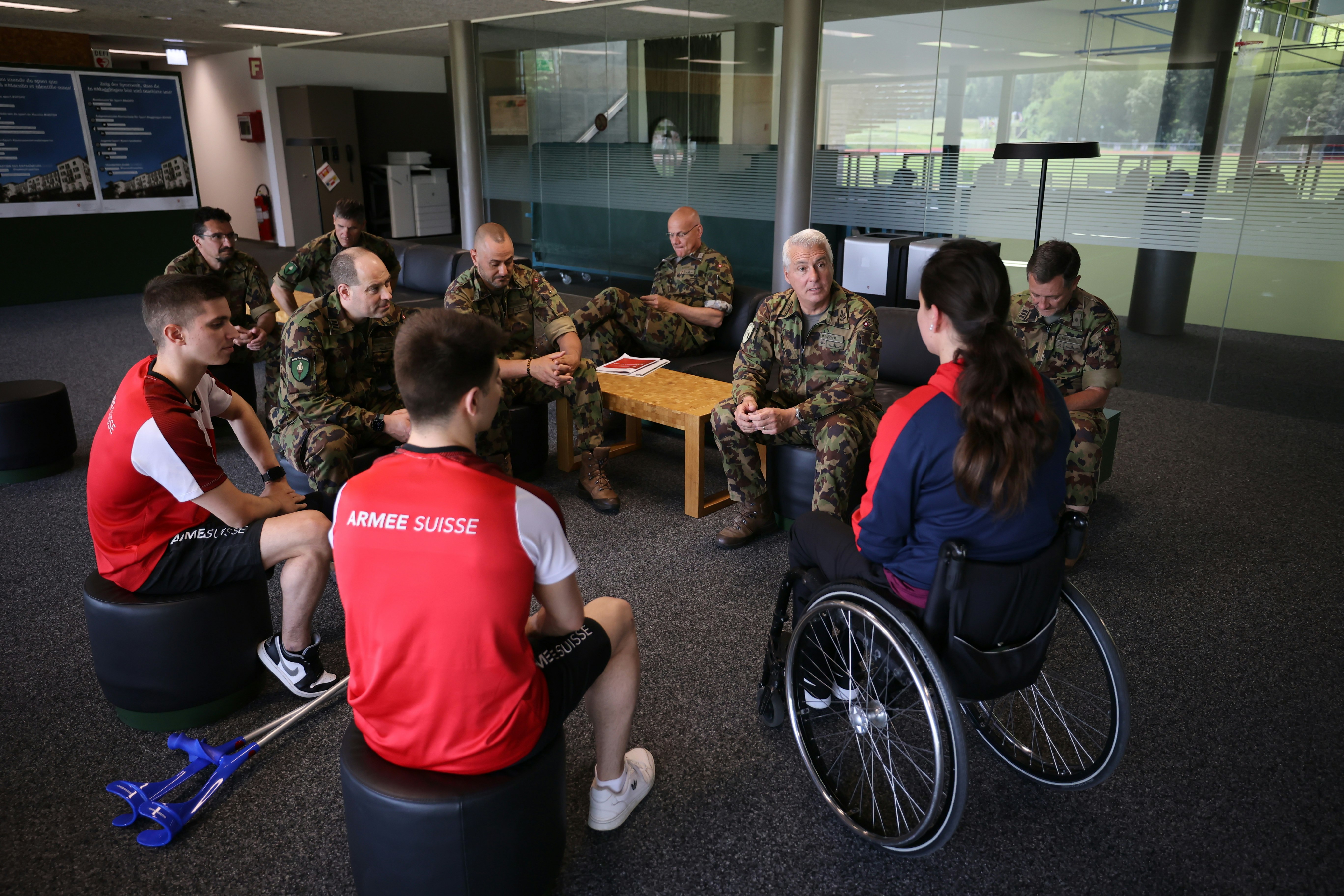 Mercredi, les recrues et soldats sport d'élite ont reçu une visite de marque dans la halle de la Fin du Monde à Macolin. Le divisionnaire Mathias Tüscher (56 ans), commandant de la division territoriale 1, a pu se faire une idée de l'entraînement d'un-e sportif/ve d'élite et a eu de nombreux échanges avec les athlètes ainsi qu'avec les entraîneurs.