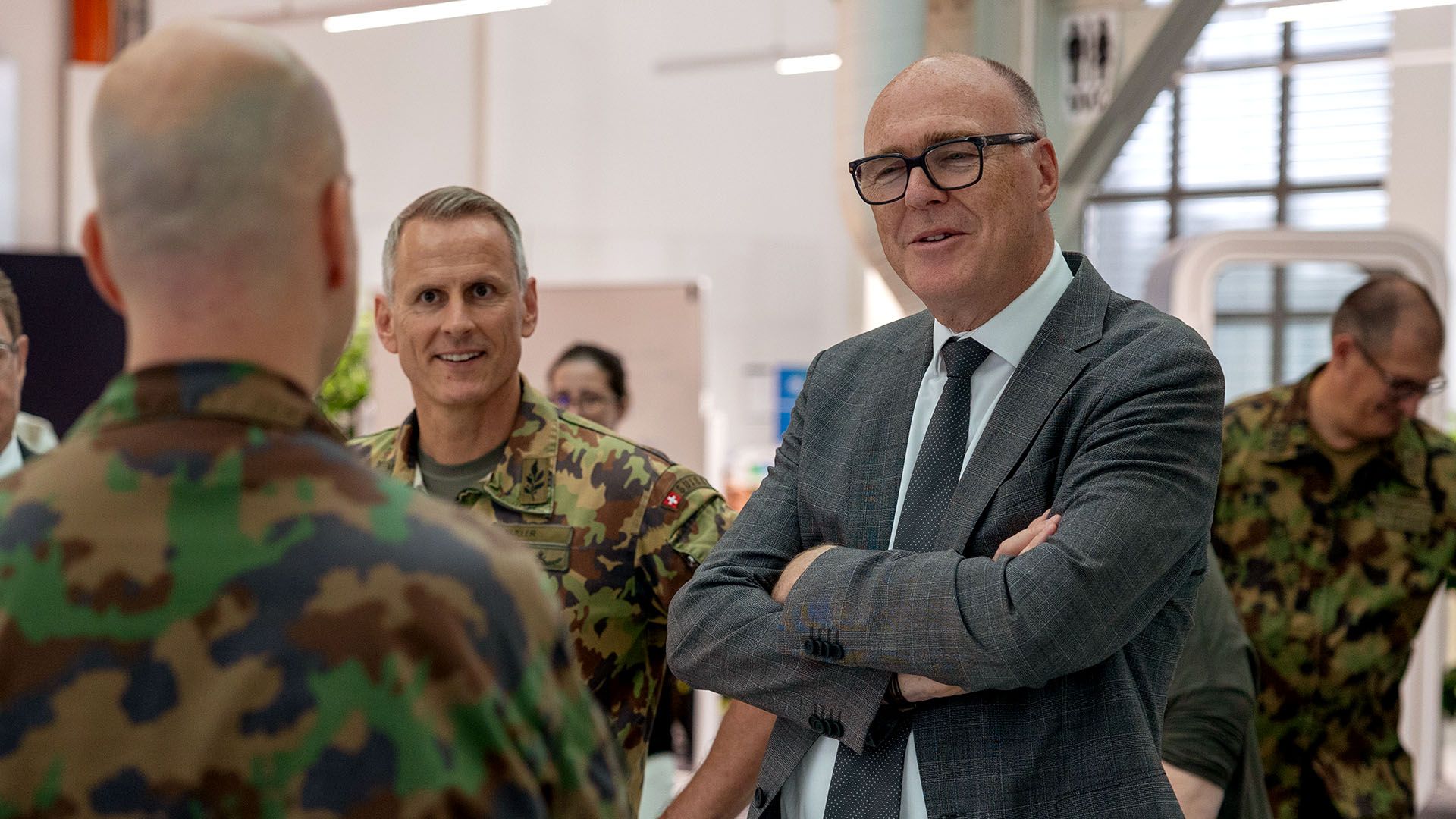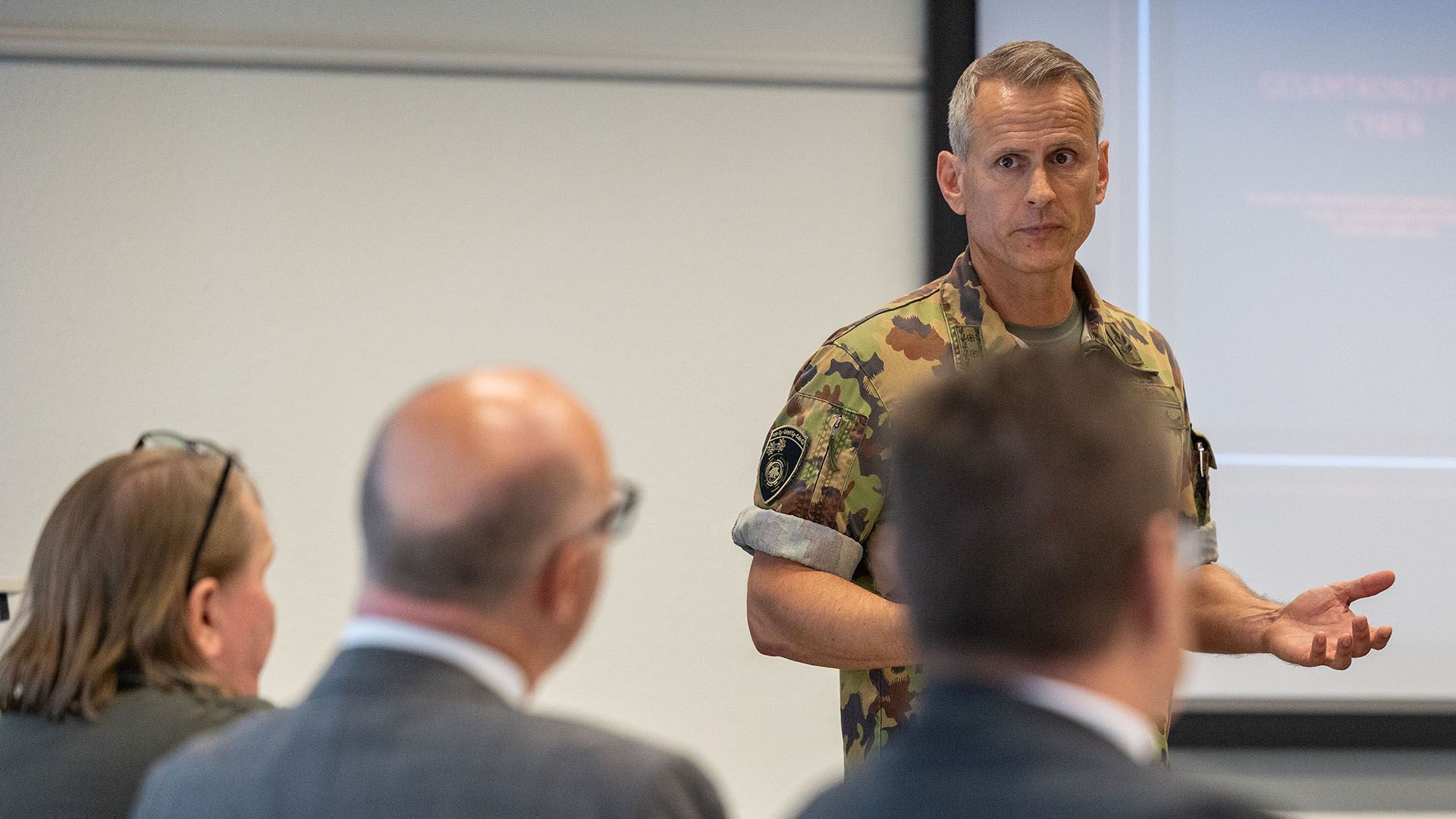 Le conseiller fédéral Pfister en visite au commandement cyber