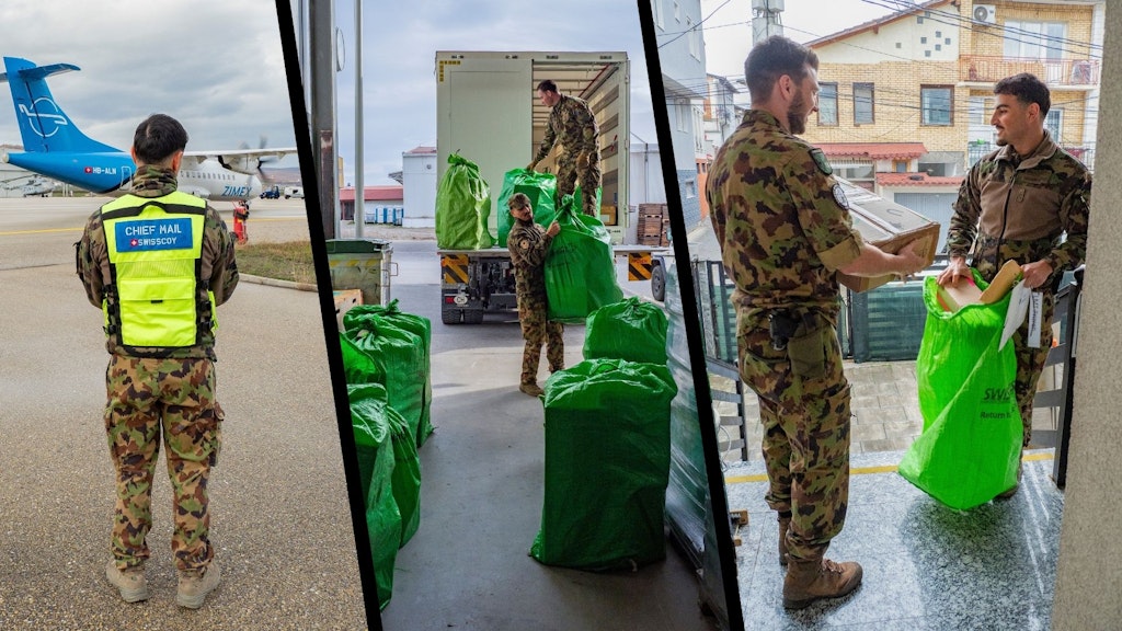 Le voyage commence par un mardi matin gris, avec le trajet vers l'APOD à Slatina. Le vol de ravitaillement en provenance de Suisse y atterrit à l'heure. Le courrier qui arrive est réceptionné, tandis que les sacs postaux provenant de la zone d'engagement sont chargés pour être renvoyés en Suisse. En quelques minutes seulement, les bagages et le courrier en provenance de Suisse sont déchargés, et les envois provenant de la zone d'engagement sont déjà soigneusement rangés dans l'avion par l'équipe de manutention. L'équipage de la compagnie de transport travaille comme une horloge bien réglée. Le chef de la poste de campagne du contingent est chargé de coordonner toute la logistique du chargement avec le pilote et de s'assurer que le fret est placé dans la bonne partie de l'avion.