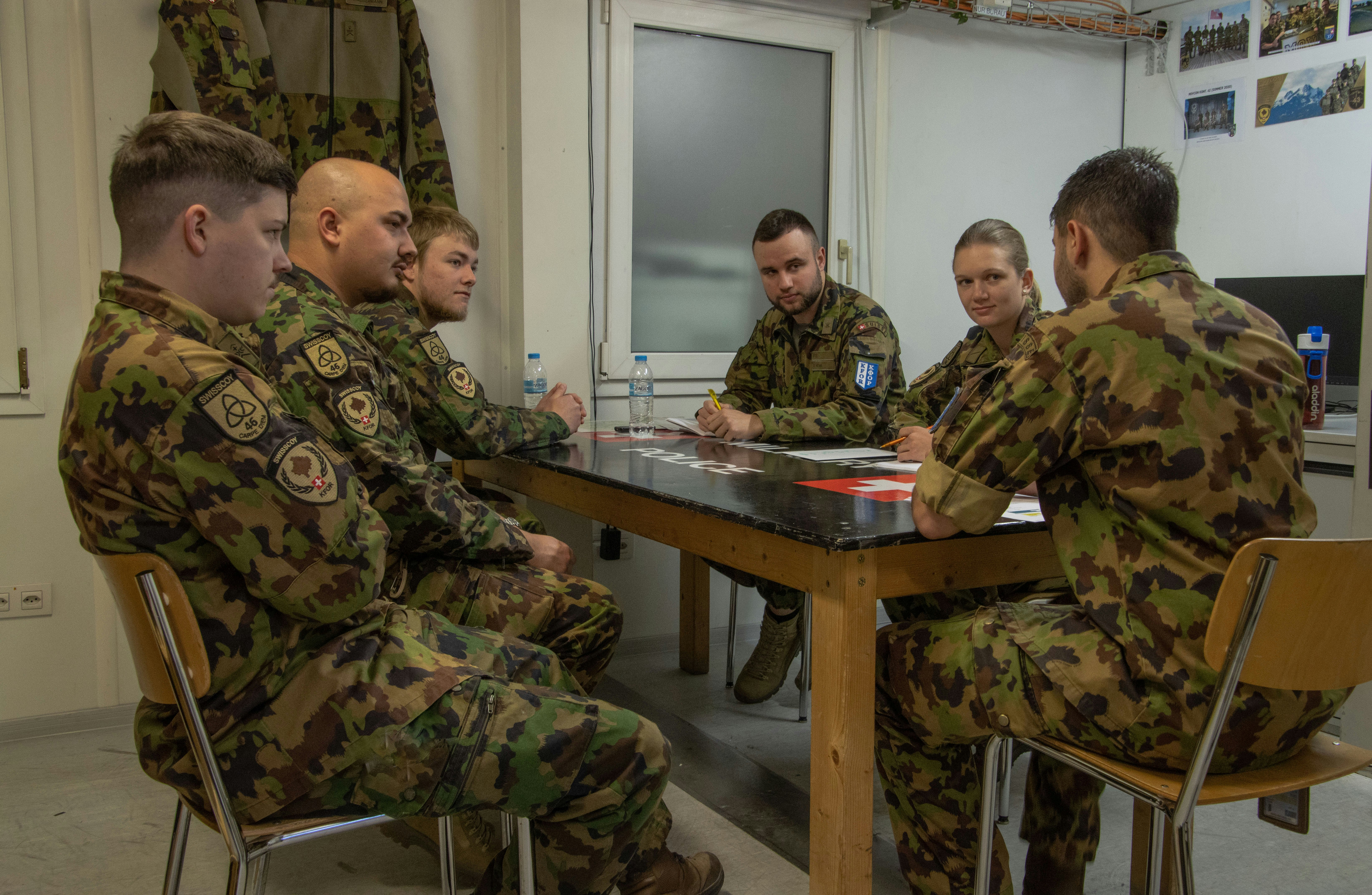 Une fois par semaine, Nadir Ethenoz assure le briefing de sa jeune équipe. Le capitaine a prolongé son engagement au Kosovo. Il a déjà servi au sein du contingent 45 en qualité de spécialiste de l’aide au commandement. Dans sa fonction de S6, le Romand dirige maintenant une équipe de cinq personnes. Il sait très bien ce que signifie être assis douze heures par jour devant un appareil radio et assurer le procès-verbal des déplacements de chaque véhicule. « Le défi pour les opérateurs, c’est de rester éveillés et attentifs, même après de longues séquences de travail qui peuvent parfois être très calmes. »