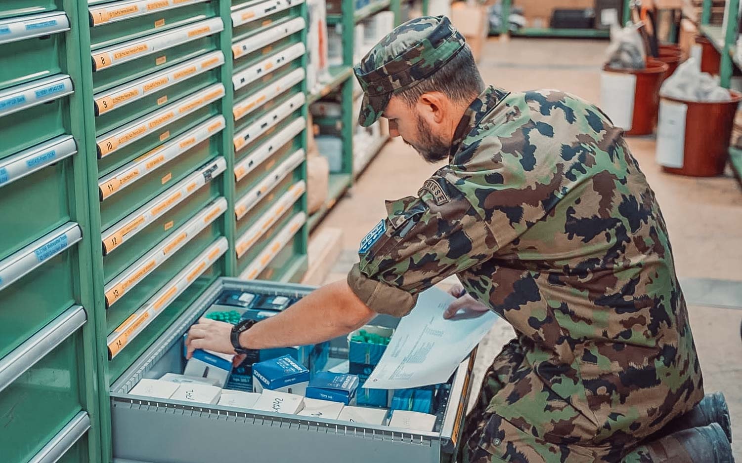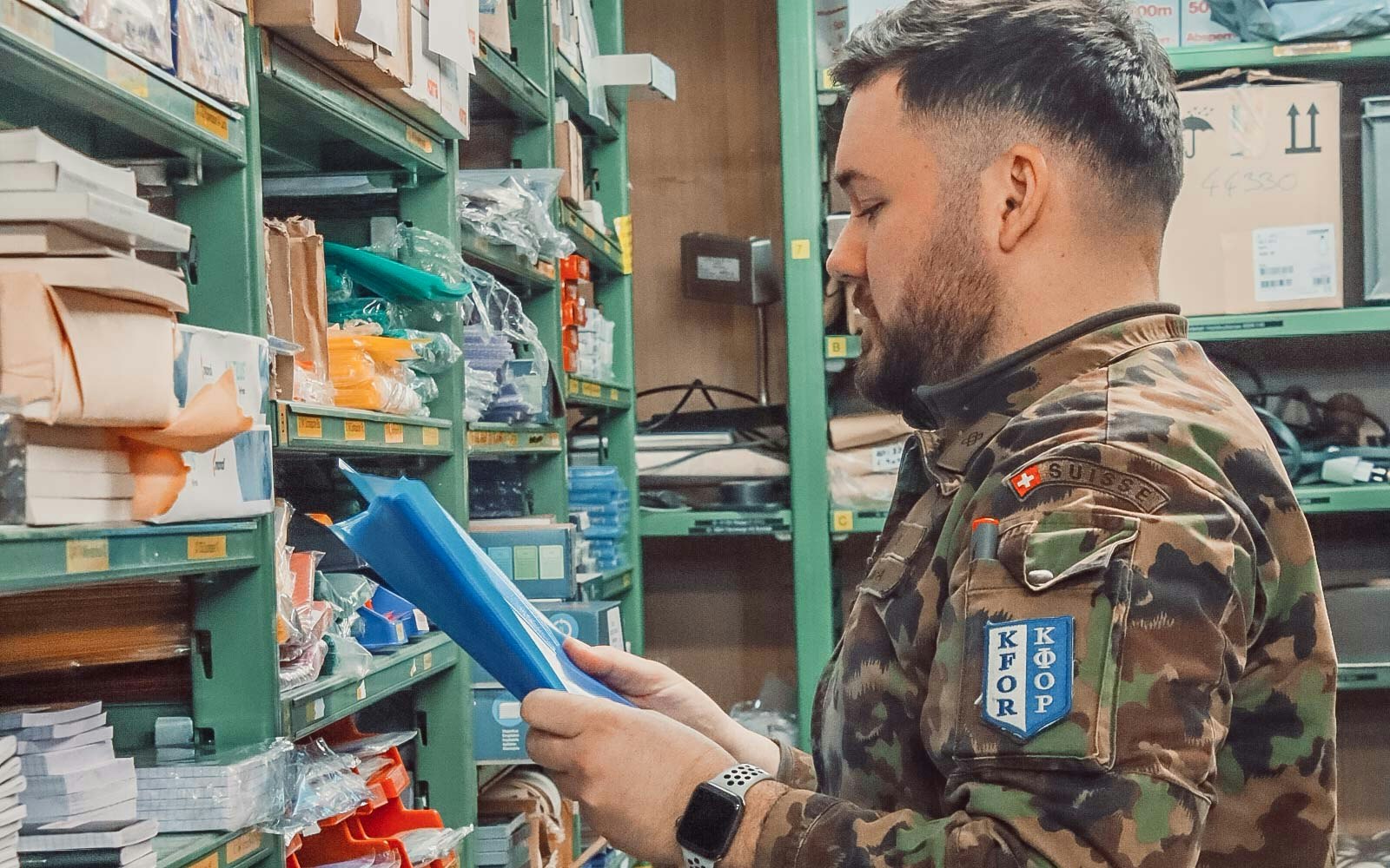 « Le groupe de ravitaillement approvisionne tout le contingent en matériel. On peut le comparer à une sorte de Base logistique de l’armée (BLA) qui agirait depuis l’étranger », explique le premier-lieutenant Argjend Mustafa, chef de groupe. Le groupe de ravitaillement dispose ainsi d’un entrepôt permettant de stocker plus de 22 000 articles tels que des produits de nettoyage, des bandes autocollantes, du papier toilette, des articles de bureau, des outils, et même des appareils plus grands tels qu’une ponceuse et une soudeuse. Les spécialistes du ravitaillement s’occupent également de l’évacuation et de l’acquisition de marchandises et assurent la gestion de la chaîne logistique. « Lorsque quelqu’un du contingent a besoin de quelque chose, nous trouvons une solution. Par exemple, s’il manque une pièce de rechange ou un bidon d’huile, les mécaniciens viennent chez nous et nous nous occupons de tout », explique le premier lieutenant Argjend Mustafa. Pour avoir toujours suffisamment de matériel en dépôt, les spécialistes adressent leurs commandes par flux continu au Centre de compétences SWISSINT. La marchandise est livrée par transport terrestre avec les convois réguliers ou par voie aérienne dans le secteur d’engagement. Le ravitaillement aérien hebdomadaire de SWISSCOY garantit en tout temps un approvisionnement suffisant du contingent en médicaments. Le courrier postal est acheminé deux fois par semaine sur le terrain. Les objets d’une certaine taille, tels que les véhicules défectueux, les pièces de rechange pour ceux-ci et les conteneurs remplis de matériel à retourner voyagent quant à eux par convoi. « Pour le moment, nous recevons relativement beaucoup de biens destinés à la nouvelle Swiss Field House de Suva Reka, dans le secteur d’engagement. Il est important de bien saisir ces envois dans le système pour éviter que des biens disparaissent. Dans le cadre de notre travail, nous devons donc procéder à de nombreux inventaires intermédiaires ainsi qu’à des décomptes finaux, notre but étant d’éviter toute perte de matériel jusqu’à la fin du contingent, ou pour le moins, de la limiter le plus possible », poursuit le premier-lieutenant Argjend Mustafa.