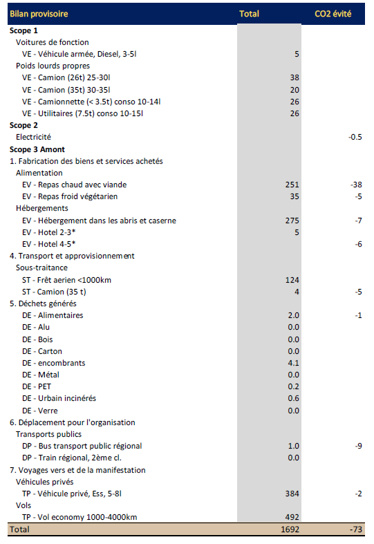 Dans le contexte des Jeux mondiaux militaires d'hiver 2025, les émissions de CO2 ont été pronostiquées à hauteur d'environ 1'700 tCO2éq. Une grande partie de ces émissions résulte des transports (voyages des délégations, transports des équipements, transports effectués par la troupe pour la préparation des jeux), de l'hébergement, ainsi que la préparation et de la distribution subsistance pour les athlètes et pour la troupe. Les efforts de la délégation suisse du CISM, organisatrice des 5e Jeux mondiaux militaires d'hiver, pour atteindre un bilan Net Zéro nécessite de rechercher de nouvelles solutions.