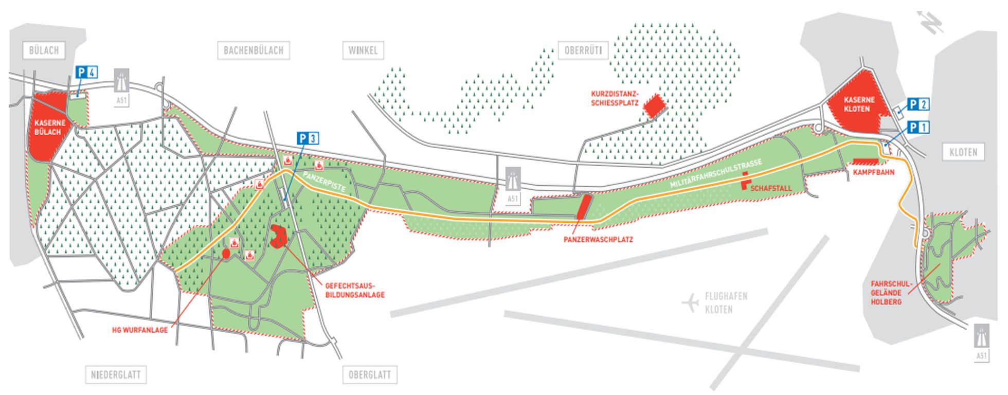 Suite à la construction de l'aéroport international de Kloten (à partir de 1947), la place d'armes a été réduite et l'artillerie a dû céder la place aux troupes de transmission en 1950. Lors de la troisième étape de construction de l'aéroport de l'époque (1976), la place d'exercice a été aménagée et mise en service comme place d'exercice pour les chars.