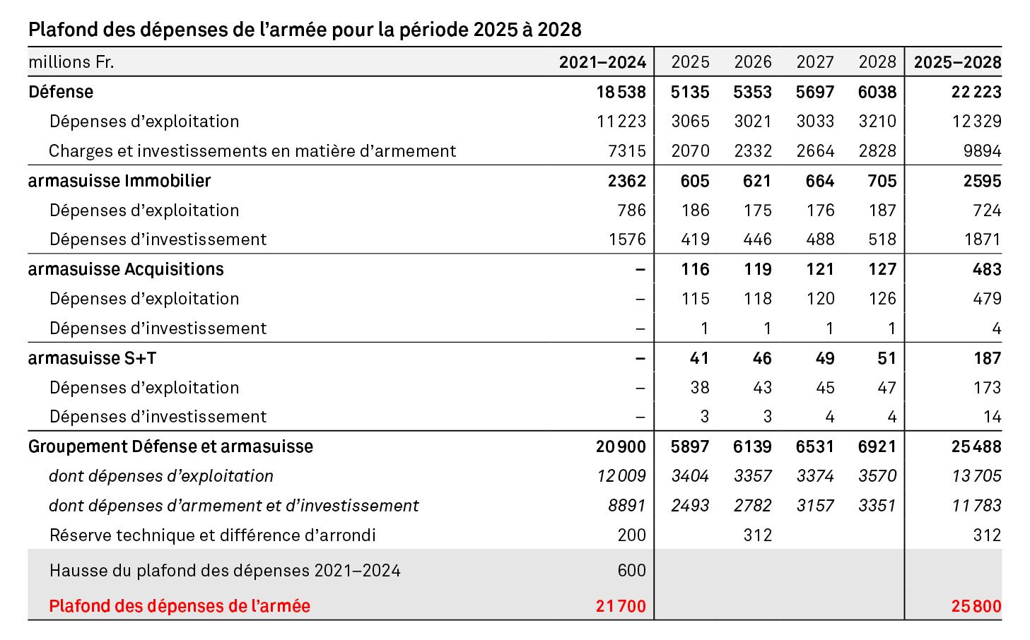 Pour couvrir les besoins financiers de l’armée, le Conseil fédéral considère que la croissance réelle des dépenses sera de 3 % en 2025 et 2026. Il estime à 5,1 % la croissance réelle en 2027 et 2028. On admet que le renchérissement sera de 1,2 % en 2025 et de 1 % dès 2026. Cette croissance se fonde sur un budget de l’armée de 5,5 milliards de francs en 2024. Le Conseil fédéral demande par conséquent pour l’armée un plafond des dépenses de 25,8 milliards de francs pour la période 2025 à 2028. Sont comprises les dépenses d’exploitation (13,7 milliards de francs), les dépenses d’armement et d’investissement (11,8 milliards de francs) ainsi qu’une réserve technique de 312 millions de francs.