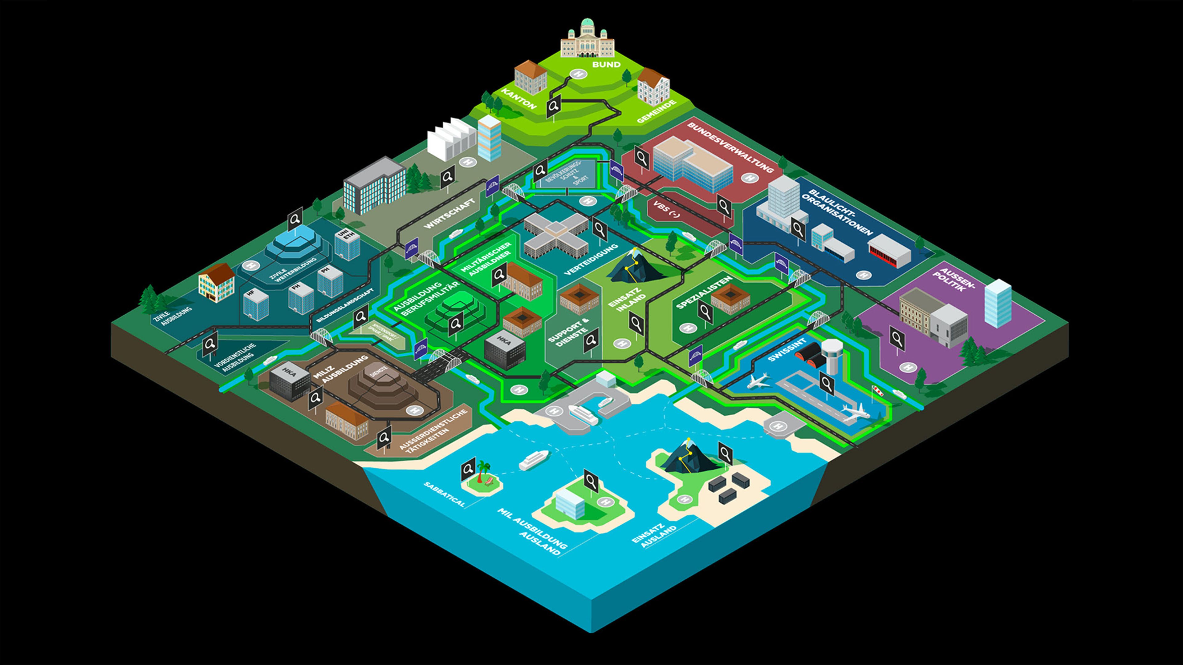 Avec ses différents quartiers, elle montre les possibilités et les options de développement de l’école obligatoire en passant par les possibilités d’évolution au sein de l’armée de milice, les formations de base et complémentaires au sein du corps professionnel des militaires de carrière jusqu’au passage à une profession civile au sein de l’administration fédérale.