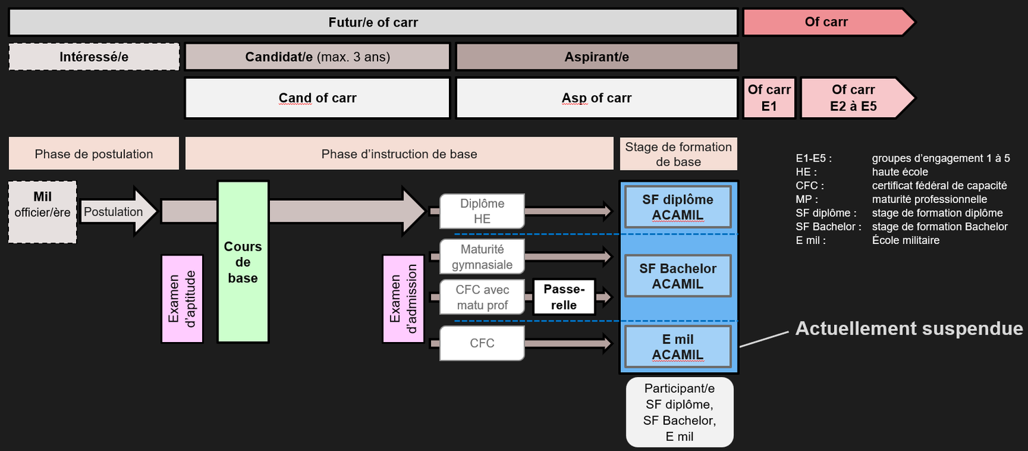 Deux stages de formation de base différents selon la formation préalable (civile et professionnelle) peuvent conduire au diplôme fédéral d’officier de carrière.