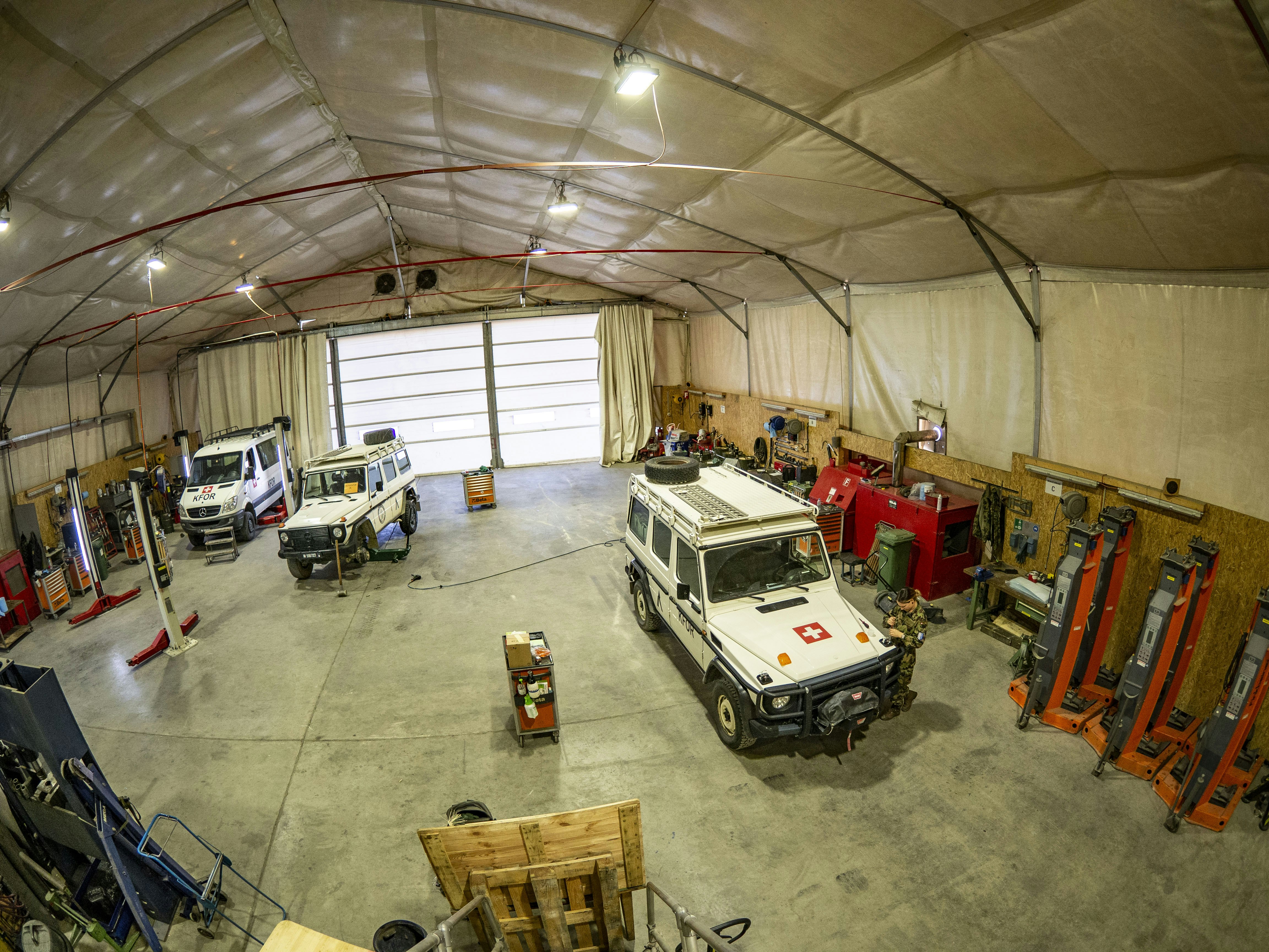 « Le clignoteur droit de ce Puch ne fonctionne plus. Je dois donc le remplacer », explique Fabienne Frommelt tout en s’exécutant. Elle est mécanicienne d’automobiles au sein du groupe de maintenance du camp Novo Selo. « J’ai d’abord appris le métier de carrossière-tôlière. Ici, je m’occupe un peu de tout, je fais ce qui vient. » À l’atelier, les spécialistes des différents corps de métier s’entraident : de la polymécanique à la construction de bateaux en passant par la serrurerie. « Ensemble, nous trouvons toujours une solution. », déclare-t-elle. Aujourd’hui, l’atelier est animé : outre Fabienne qui s’occupe de son clignoteur, on change la roue d’un Puch et on s’occupe du problème moteur d’un Mercedes Sprinter. « Nous ne nous ennuyons jamais. Il y a toujours quelque chose à faire », affirme Fabienne. Rien d’étonnant : l’ensemble du contingent dispose de quelque 120 véhicules. Tous sont pris en charge par la maint en cas de panne, puis rendus en première ligne. Maintenant en hiver, il s’agit surtout de changement de roues, de chauffage dysfonctionnel ou d’essuie-glace en grève. Puisque les pièces de rechange tardent toujours à être livrées, la maint tente d’abord de réparer les composants cassés avant de passer commande. La maint se charge également de préparer l’entretien régulier et le contrôle périodique (semblable à l’expertise pour les vhc privés). Pour ce faire, du personnel de la Base logistique de l’armée (BLA) vient en secteur d’engagement pour examiner les véhicules.