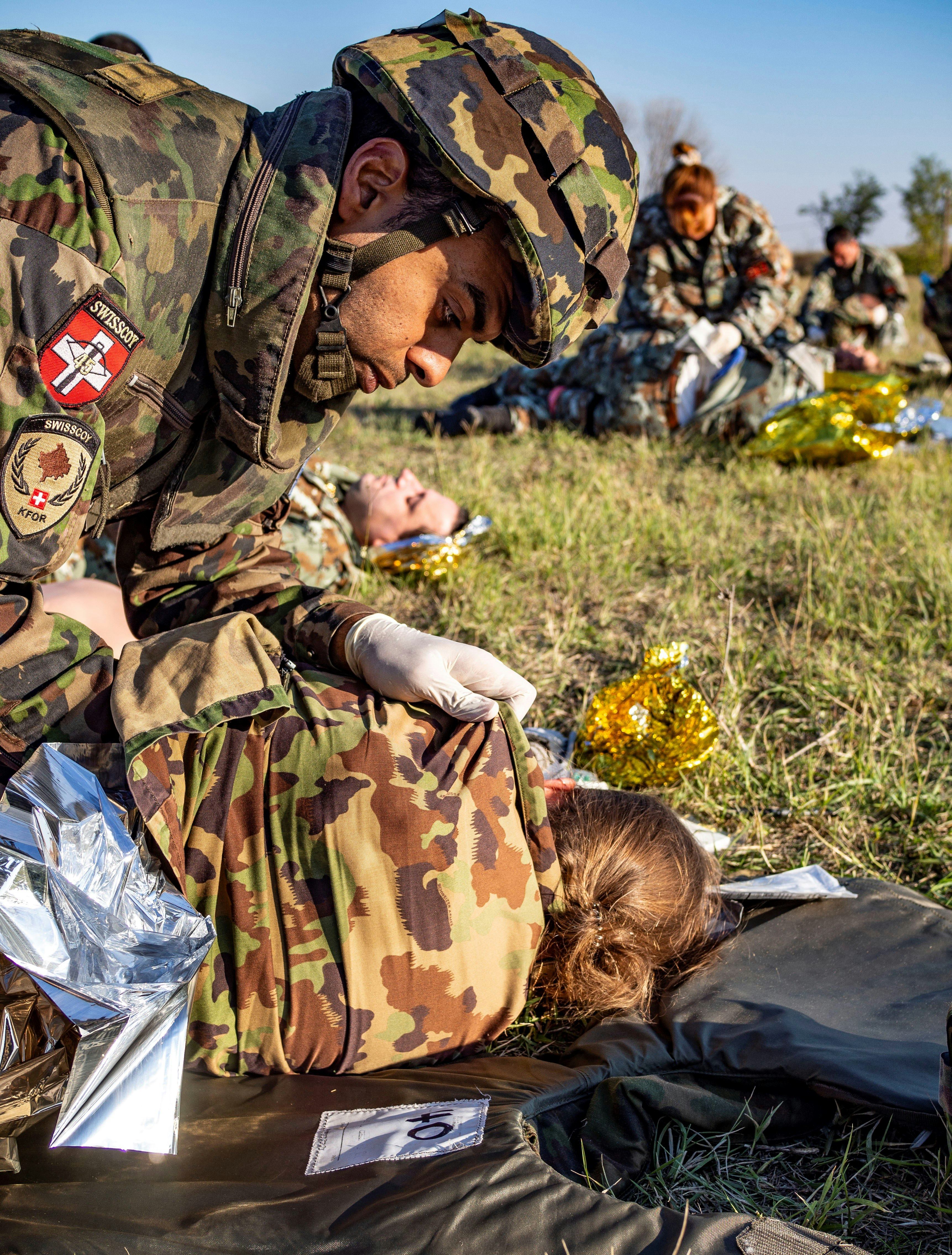 Au sein du contingent 45 de la SWISSCOY, le sgt chef Saskia Rüetschi, rempl chief nurse, et le cap Rany El Nashar, chief medical officer (CMO), participent au cours TCCC à Skopje. Tous deux profitent du savoir-faire des cinq instructeurs suisses présents : « C’est extrêmement intéressant », relève le sgt chef Rüetschi, qui a travaillé aux urgences d’un hôpital dans la vie civile. « Ici, j’apprends comment prendre en charge des patients avec des ressources limitées et peu de temps à disposition. C’est un défi énorme et vraiment passionnant. » Le cap El Nashar partage son avis : « Je pourrai sûrement utiliser ce que j’ai appris au cours TCCC dans la vie civile. Fixer des priorités, pouvoir rapidement déterminer ce qui est vraiment important et qui je dois aider tout de suite : ces compétences sont particulièrement utiles dans mon travail ».
