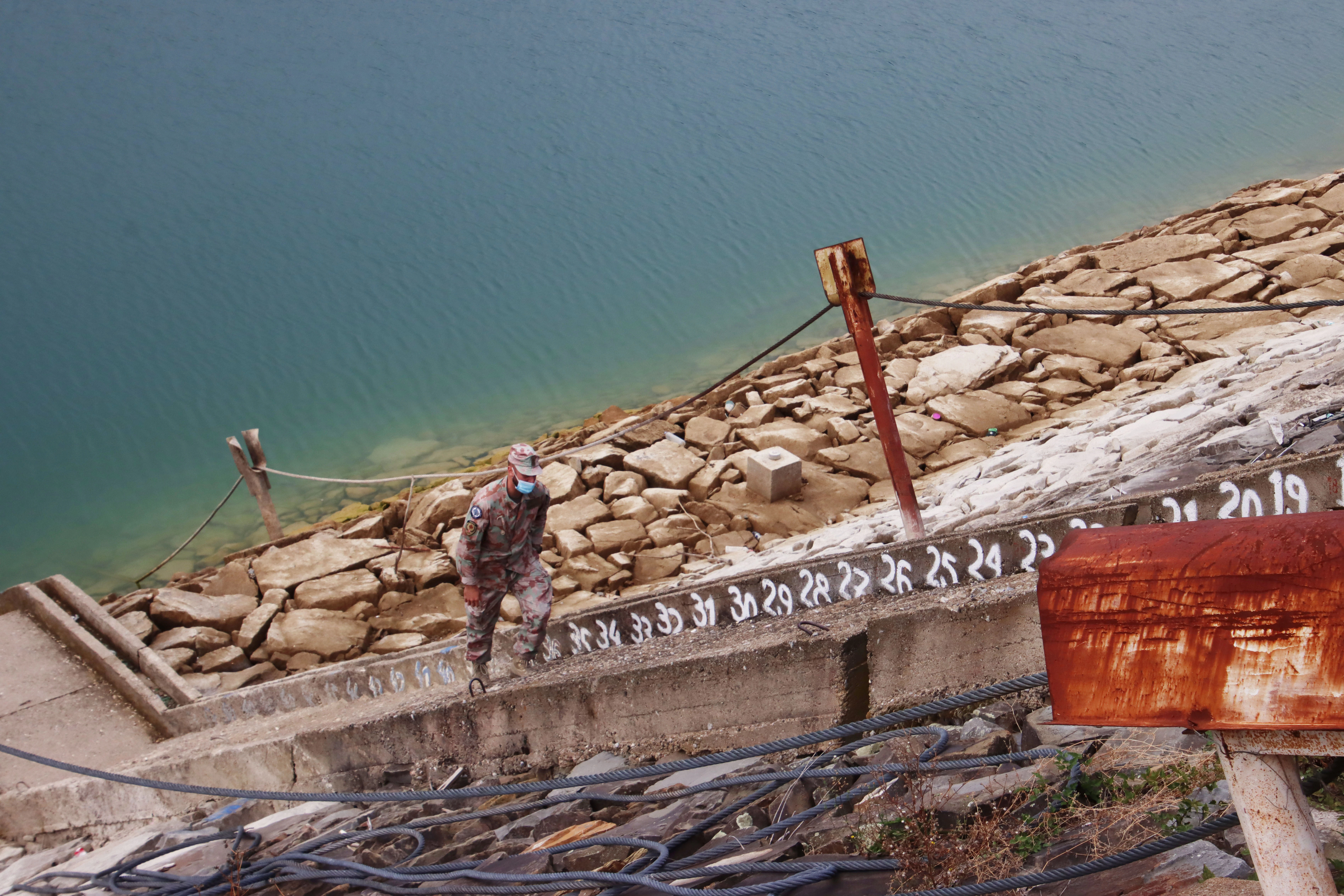 Suffisamment de temps a été prévu avant la réunion pour mesurer le niveau du lac. La LMT effectue ces mesures régulièrement, étant donné que le niveau d’eau est un indicateur direct de la consommation d’énergie de la région et permet aussi de voir si les centrales à charbon d’Obiliq captent assez d’eau de refroidissement dans le canal. Les chiffres inscrits sur les marches des escaliers qui conduisent au lac servent à indiquer le niveau d’eau. Fabio Serioli note ces informations puis se rend avec Yuri Buchmeier à la réunion prévue.