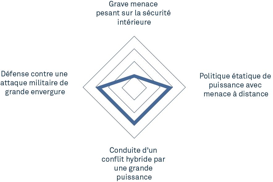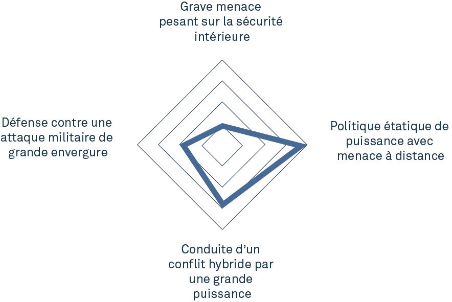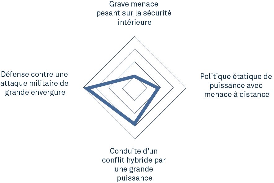Dans ce cas de figure, le développement des capacités est axé sur la défense contre une attaque armée dans tous les espaces d’opération. L’accent est mis en priorité sur la protection de l’espace aérien supérieur. Des forces terrestres bien protégées et hautement mobiles, équipées de moyens robustes, sont tout aussi importantes.