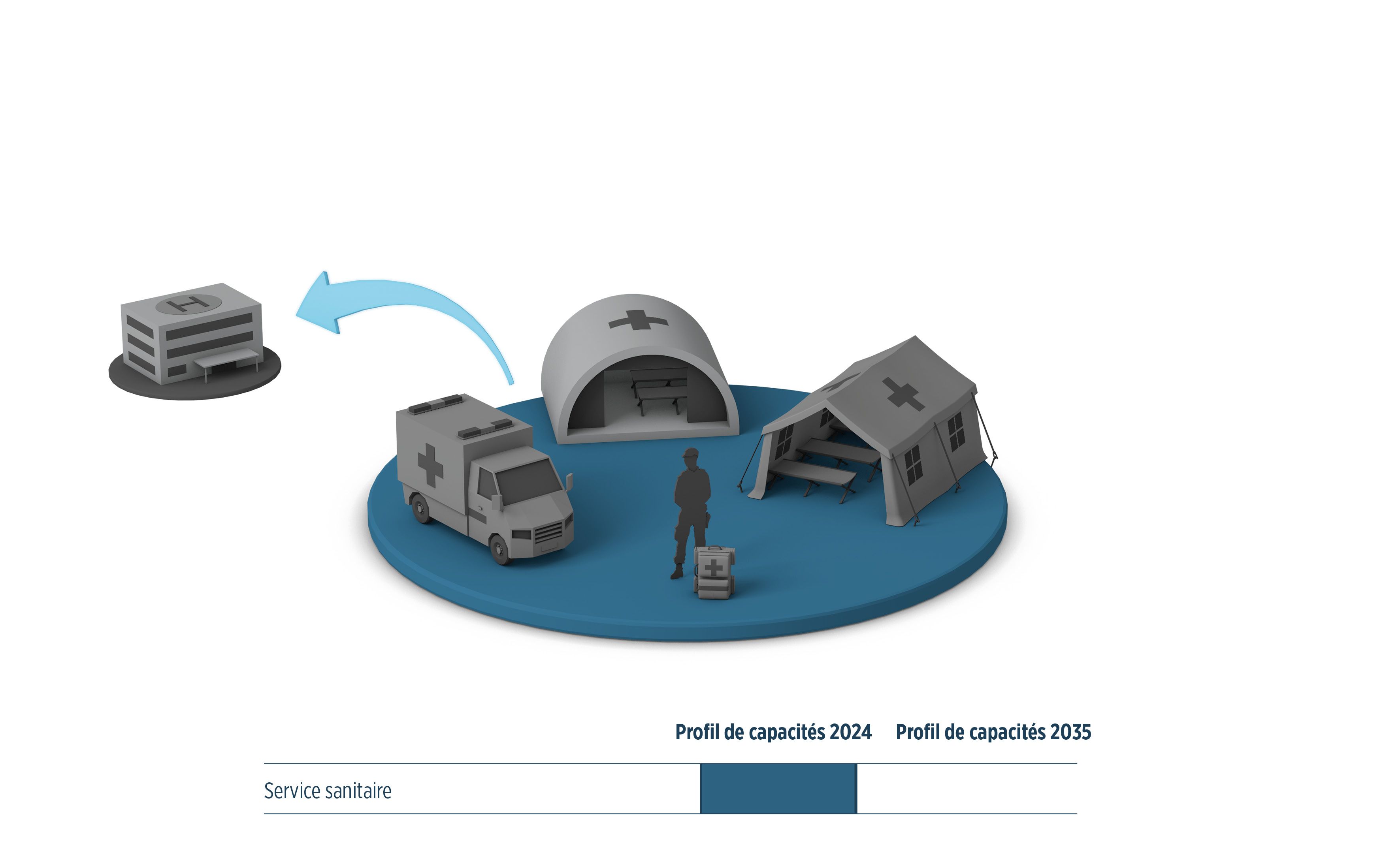 Le service sanitaire de l’armée se compose du service sanitaire de base et du service sanitaire de la troupe. Le premier assure les soins de santé primaires de l’armée dispensés dans des centres médico-militaires ou par la Pharmacie de l’armée, alors que le second est responsable de la prise en charge sanitaire des formations militaires. La troupe ne bénéficie aujourd’hui que d’un approvisionnement minimal, en raison des importantes lacunes d’ordre matériel et personnel. Le transport protégé de patients est très restreint faute de véhicules appropriés, une partie de la flotte existante étant composée de véhicules transformés et détournés de leur utilisation initiale. Quant aux postes de secours sanitaires, ils ne répondent plus aux exigences actuelles en matière de mobilité, de disponibilité et de fonctionnalité. Leurs équipements médicaux doivent être modernisés.