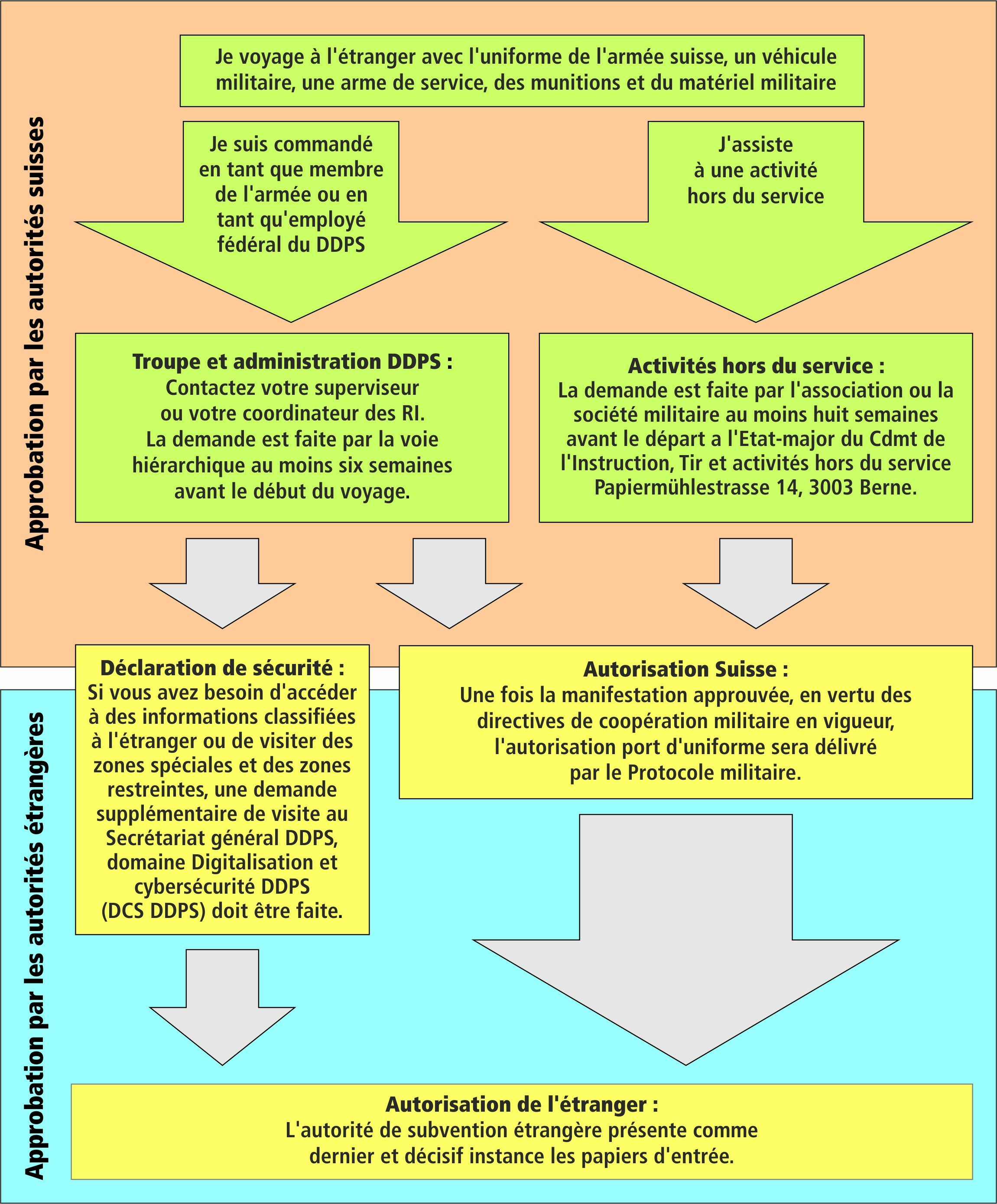 Les voyages militaires à l'étranger sont soumis à une autorisation conformément aux «Directives sur les contacts internationaux de l’armée (INTAKTA)»