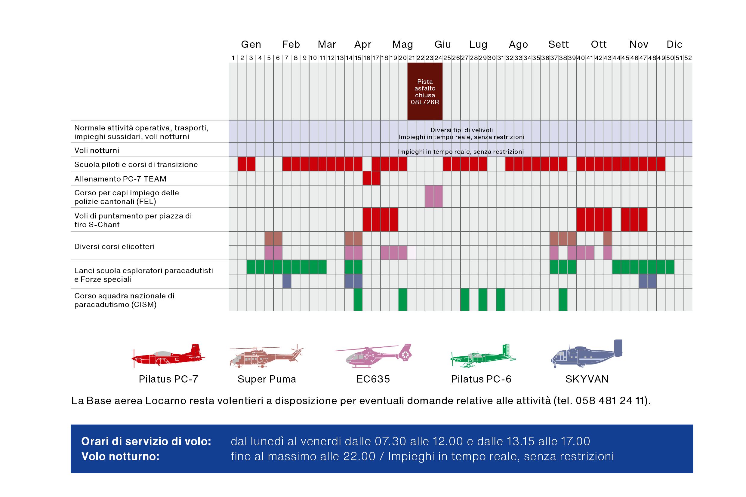 Tutte queste attività generano circa 10'000 movimenti di volo e 13'500 pernottamenti all'anno presso la Base aerea Locarno.