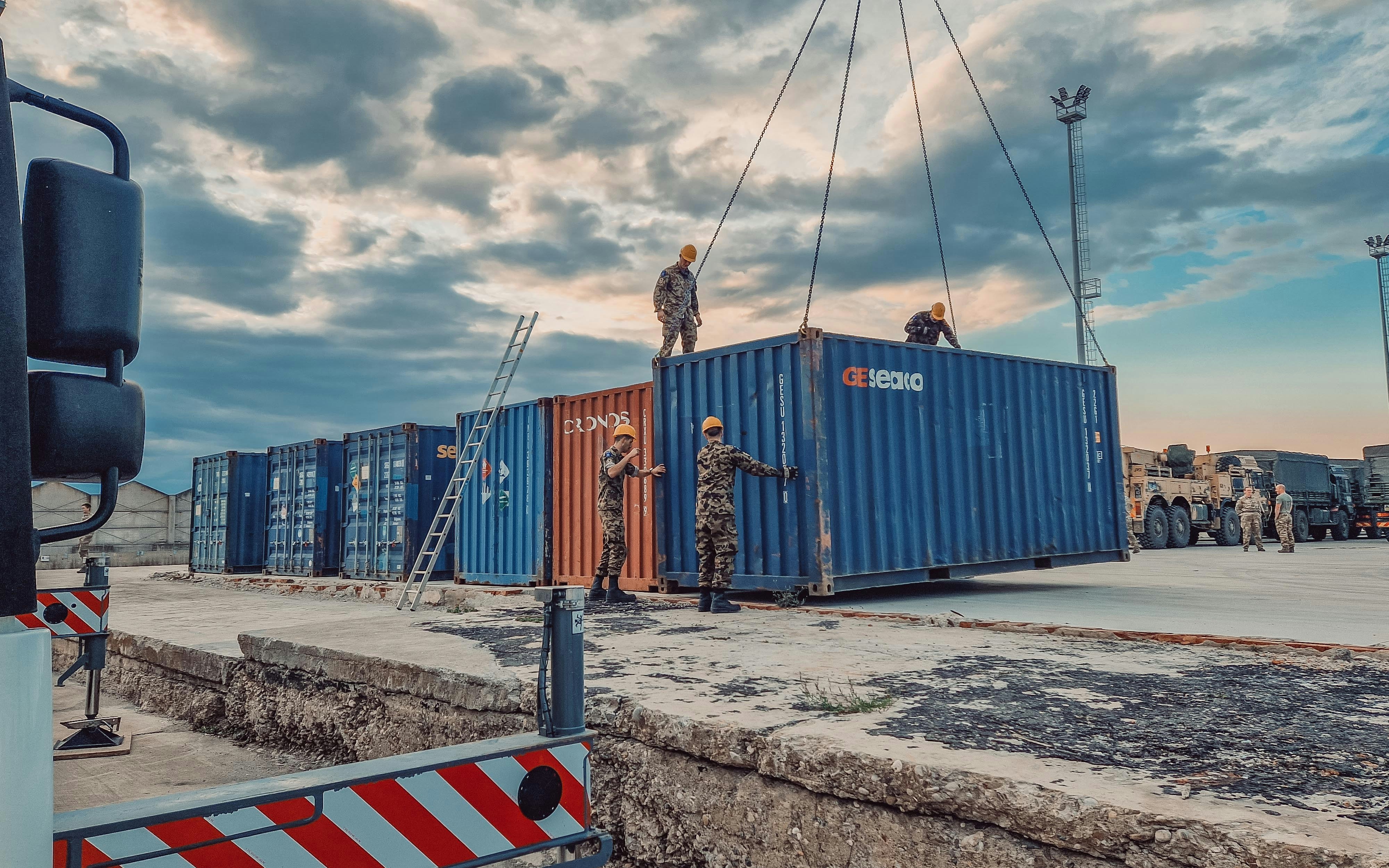 Il lavoro di squadra esemplare della sezione di trasporto ha consentito di scaricare rapidamente i container a Durazzo. «Abbiamo scaricato i nostri veicoli con la gru, mentre gli austriaci hanno scaricato i loro con i loro dispositivi a gancio». È stato necessario interrompere brevemente lo scarico soltanto una volta per fare il pieno ad alcuni veicoli. Nonostante sia stata una giornata molto lunga per tutto il team, tutti hanno collaborato fino alla fine.