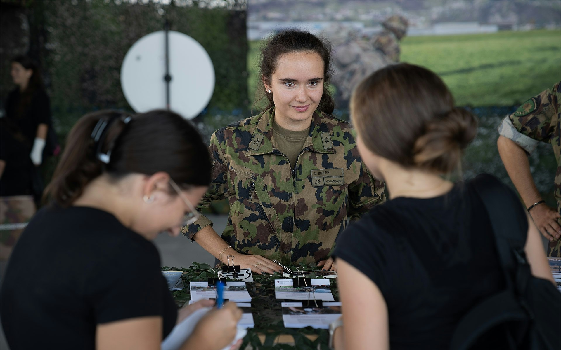Il team è tuttavia in grado di fornire informazioni su ogni funzione o di mostrare dove è possibile trovarle. Sanya Sidler afferma di aver ricevuto anche domande specifiche da parte delle donne: «Spesso si tratta di aspetti fondamentali, ad esempio se nella scuola reclute ci sono dormitori separati o come fare se una donna in servizio diventa madre». Il sergente constata comunque che molte donne sono già ben informate con domande specifiche prima di visitare lo stand dell’esercito.