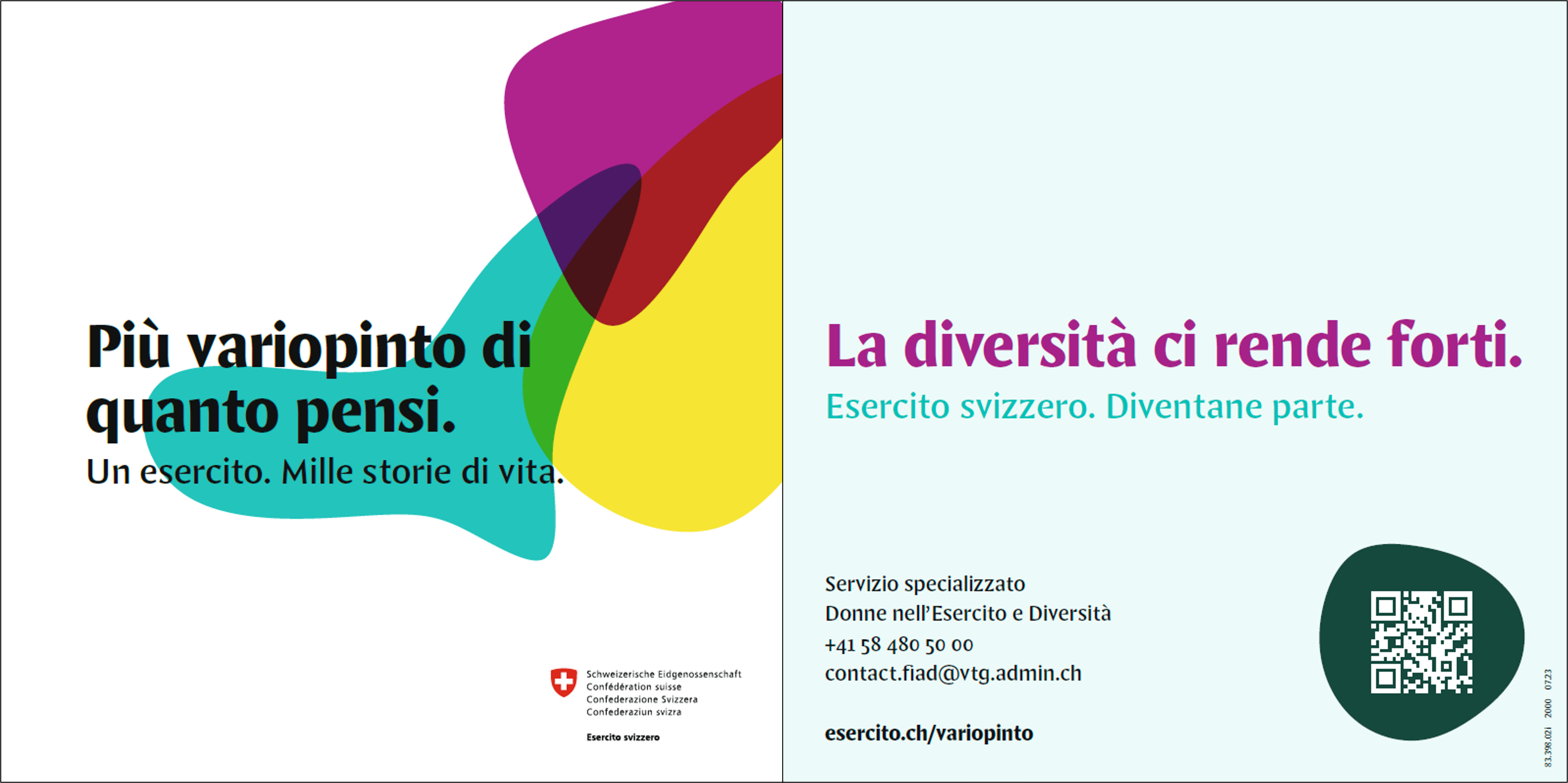 L'Esercito svizzero sta diventando sempre più diversificato: i membri dell'esercito hanno delle storie di vita differenti. Essi vengono considerati per le loro caratteristiche, interessi e talenti versatili. E lo saranno ancora di più in futuro. La diversità della popolazione svizzera deve essere integrata ancora meglio nell'Esercito svizzero.