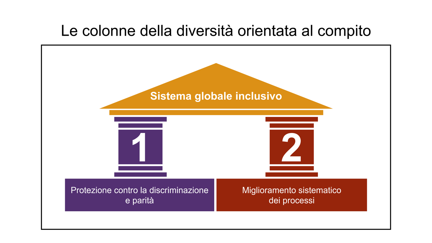 Affinché la diversità ambita e voluta sfoci in inclusione, devono essere soddisfatti alcuni requisiti di base. Questi requisiti sono riassunti nella Strategia sulla diversità «sistema globale inclusivo Esercito svizzero / Aggruppamento Difesa» sottoforma di due colonne: