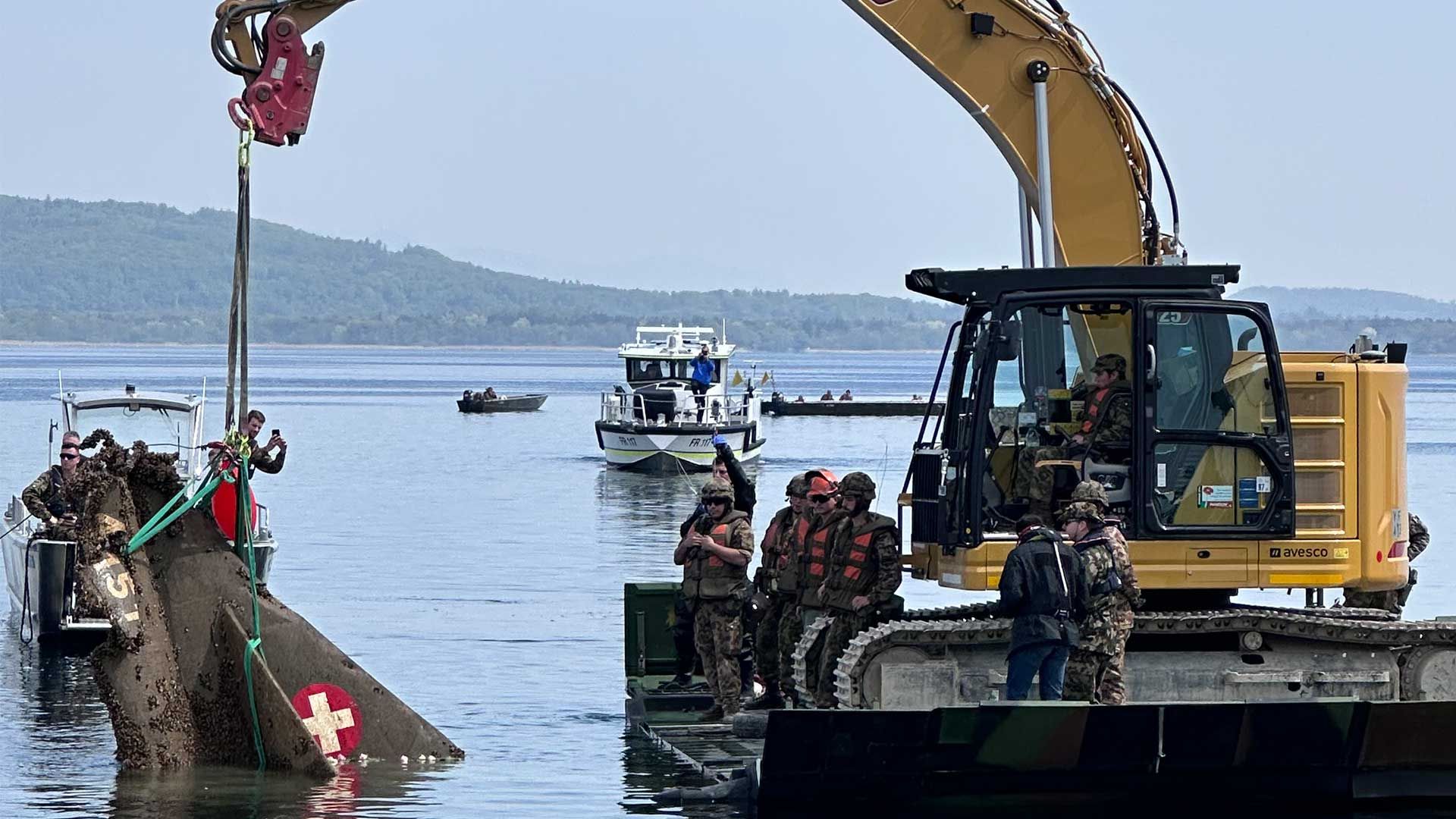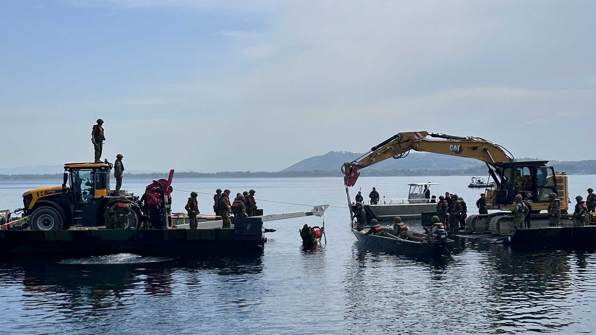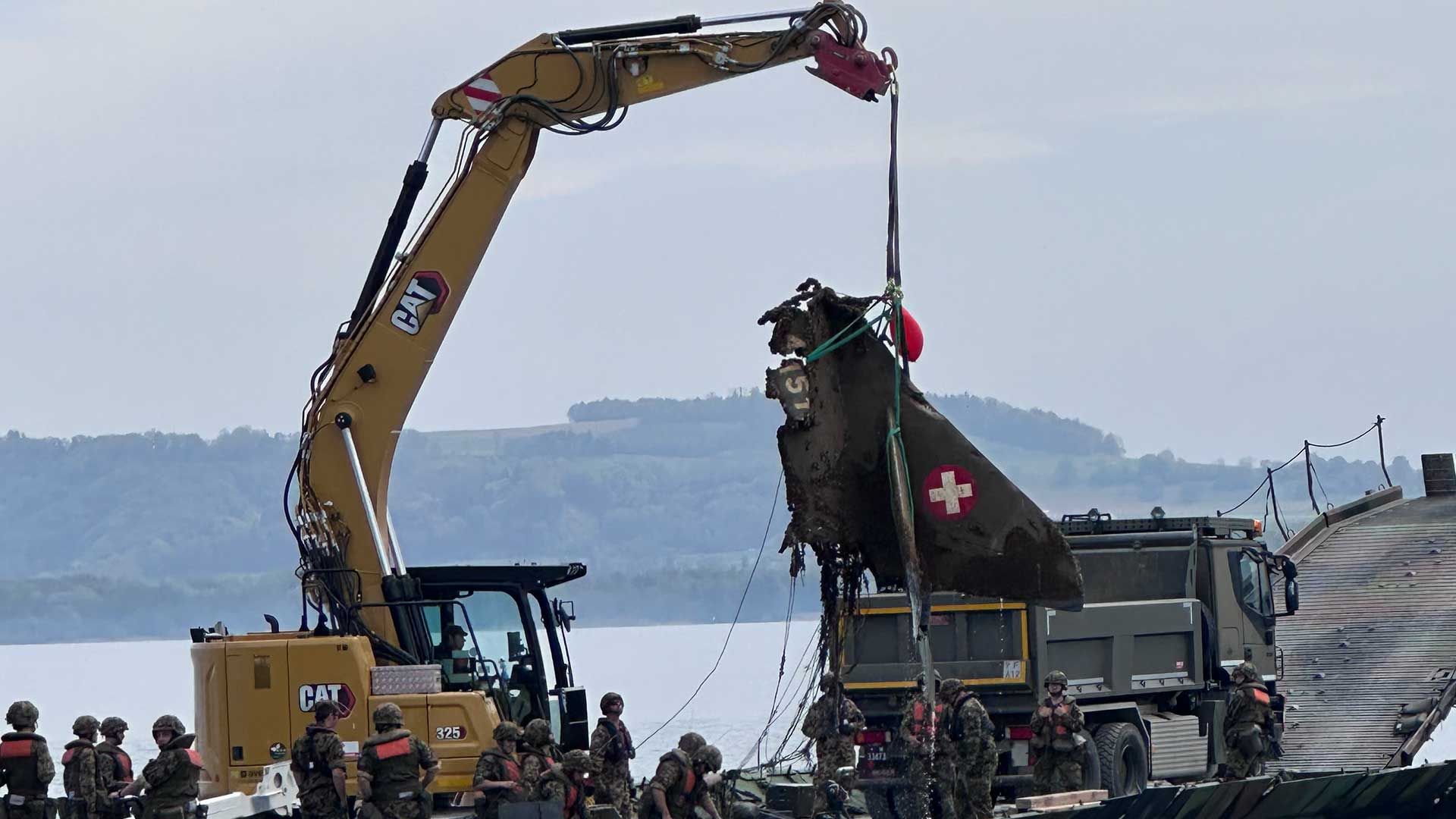 Riportare il rottame in superficie richiede molta forza, ed è qui che entrano in gioco gli specialisti del comando d’intervento e istruzione 74, del battaglione d’intervento d’aiuto in caso di catastrofe e della scuola del genio 73. Due ponti galleggianti trasportano un trattore con argano, una benna ribaltabile, un’escavatrice e il relativo equipaggio sul posto d’intervento. I sommozzatori viaggiano su imbarcazioni separate. Inoltre, i corpi di polizia dei cantoni limitrofi garantiscono la sicurezza sul lago e in particolare sul relativo perimetro. Il trattore riporta il relitto in superficie, dove l’escavatrice lo raccoglie con la sua pinza e lo deposita sull’autocarro con benna ribaltabile. I traghetti tornano poi a terra.