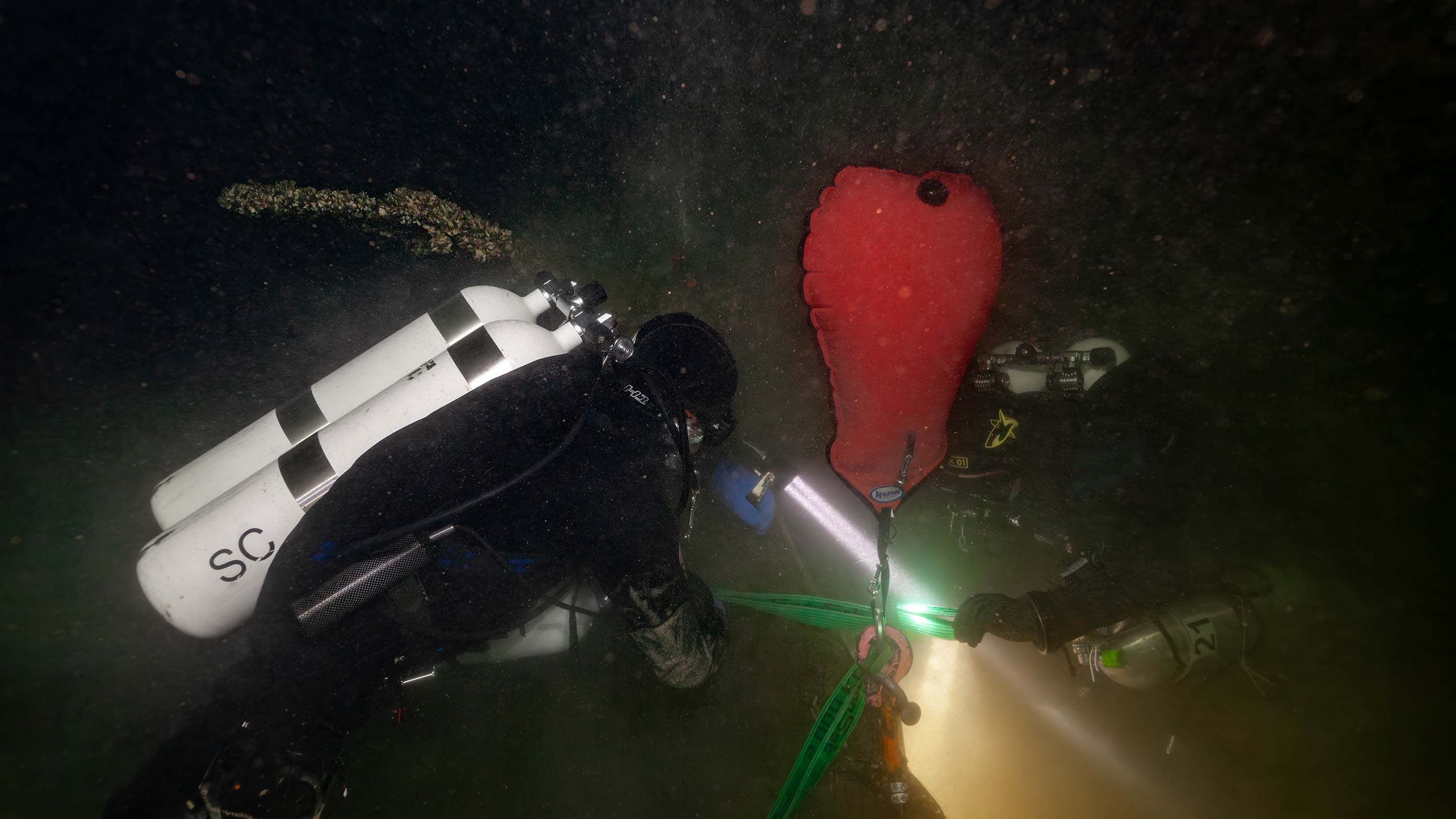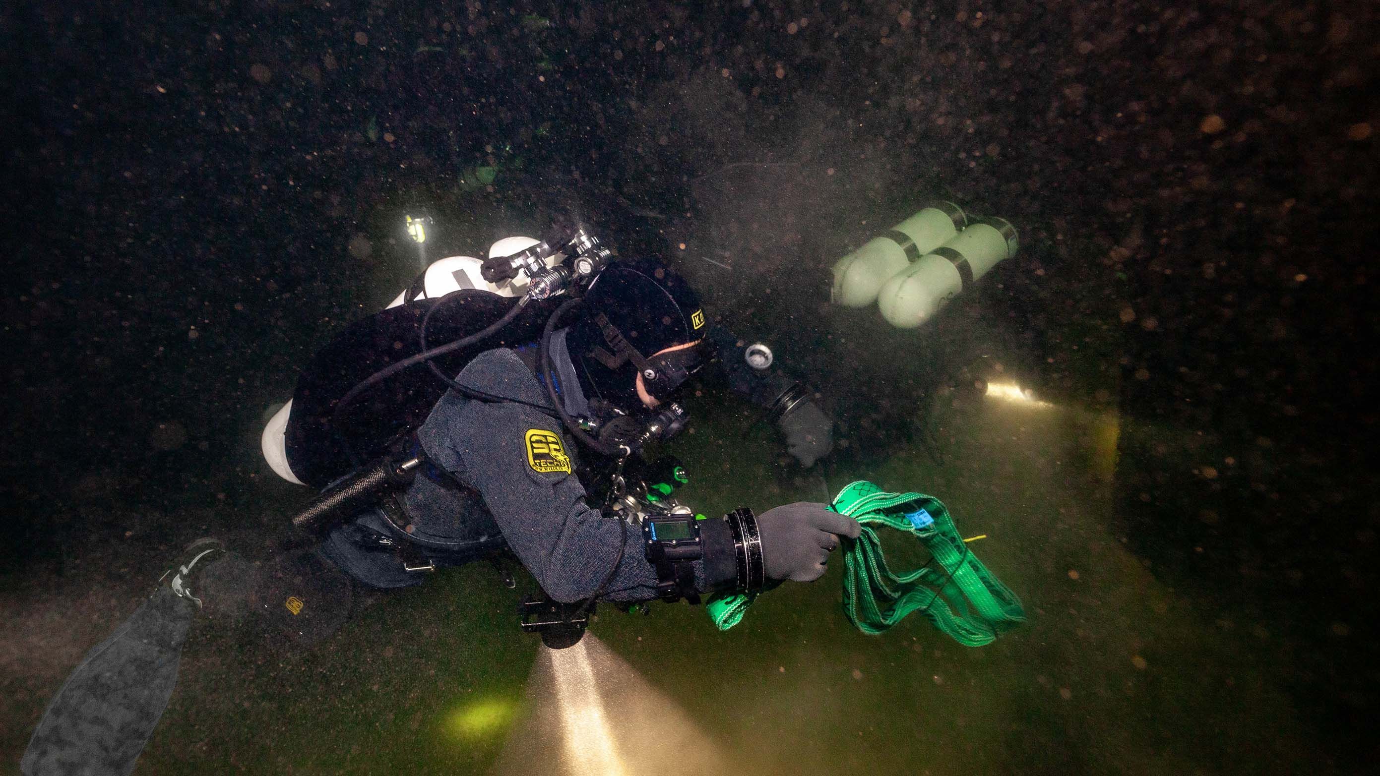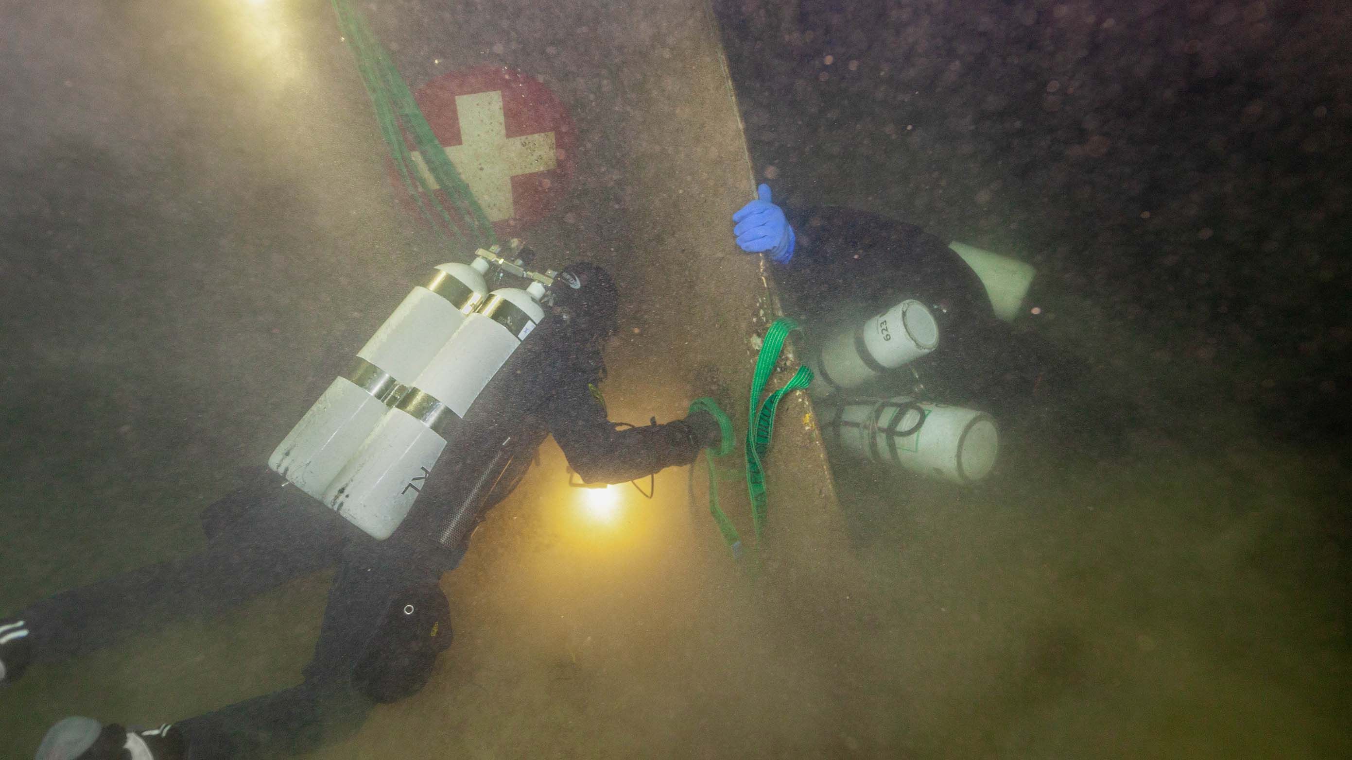 Dopo una meticolosa preparazione, è finalmente giunto il momento di mettersi all’opera. Per prima cosa, si immergono lungo una cima di discesa fino al sito d’intervento, dove approntano tre punti di ancoraggio nella parte posteriore della fusoliera. Qui sarà agganciato successivamente il gancio della gru per sollevare il rottame. L’aiutante di stato maggiore Michael Schnyder descrive così le sfide dell’immersione a grandi profondità: «La pressione in profondità è di diverse volte superiore a quella in superficie, con diverse conseguenze. La comunicazione tramite segnali manuali deve essere precisa. Dobbiamo essere preparati a tutte le eventualità, perché non possiamo semplicemente tornare in superficie per comunicare».