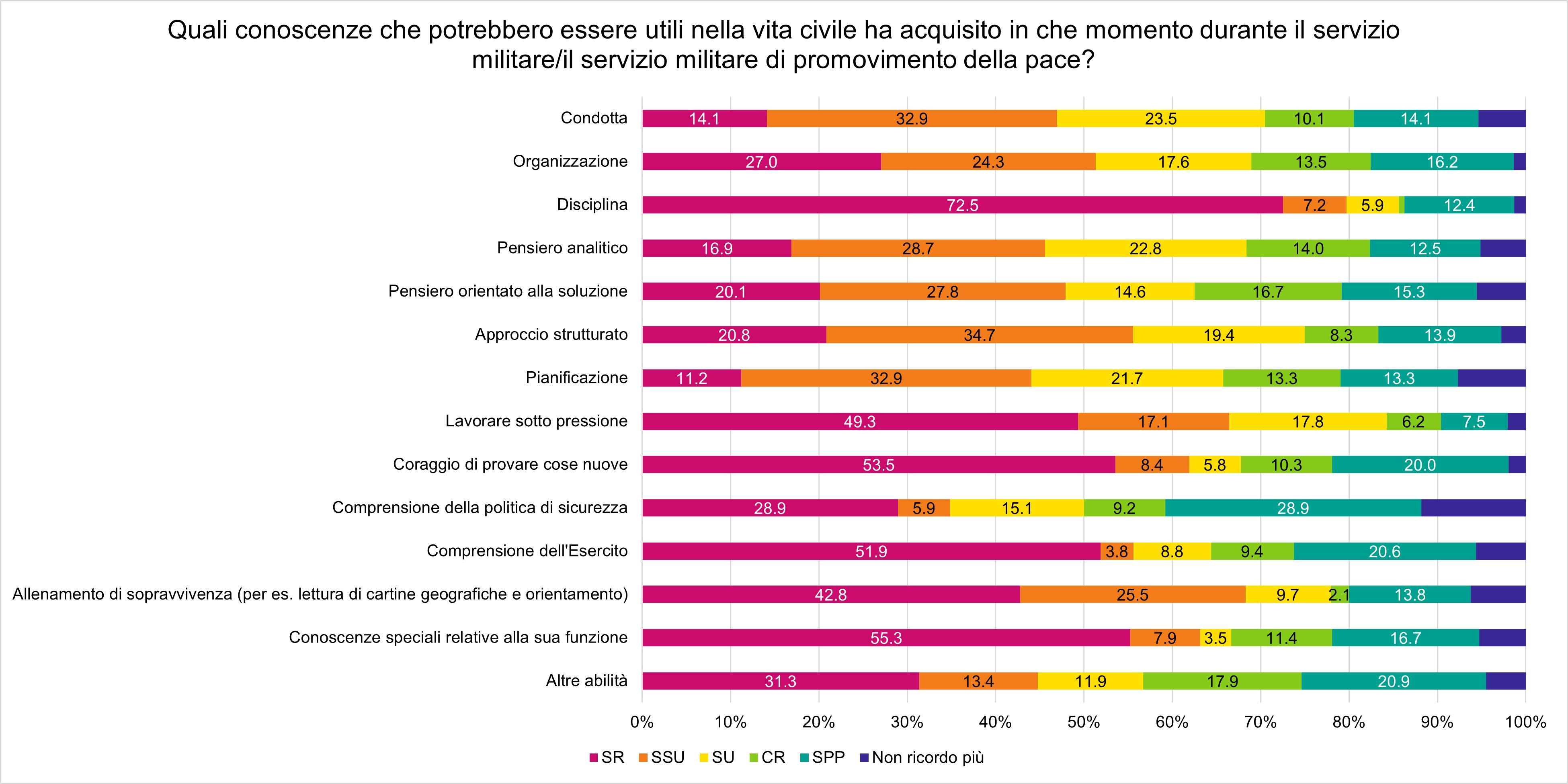 Durante la scuola reclute, il primo passo nella vita militare, si fanno tante esperienze e si acquisiscono molte conoscenze che possono essere utili anche nella vita civile, ad esempio la disciplina, il coraggio di provare cose nuove, il lavorare sotto pressione, la comprensione dell'Esercito e l'allenamento di sopravvivenza. Alcune competenze vengono acquisite principalmente nelle scuole quadri, come la condotta, il pensiero analitico, l’approccio strutturato e la capacità di pianificazione (cfr. Figura 2).