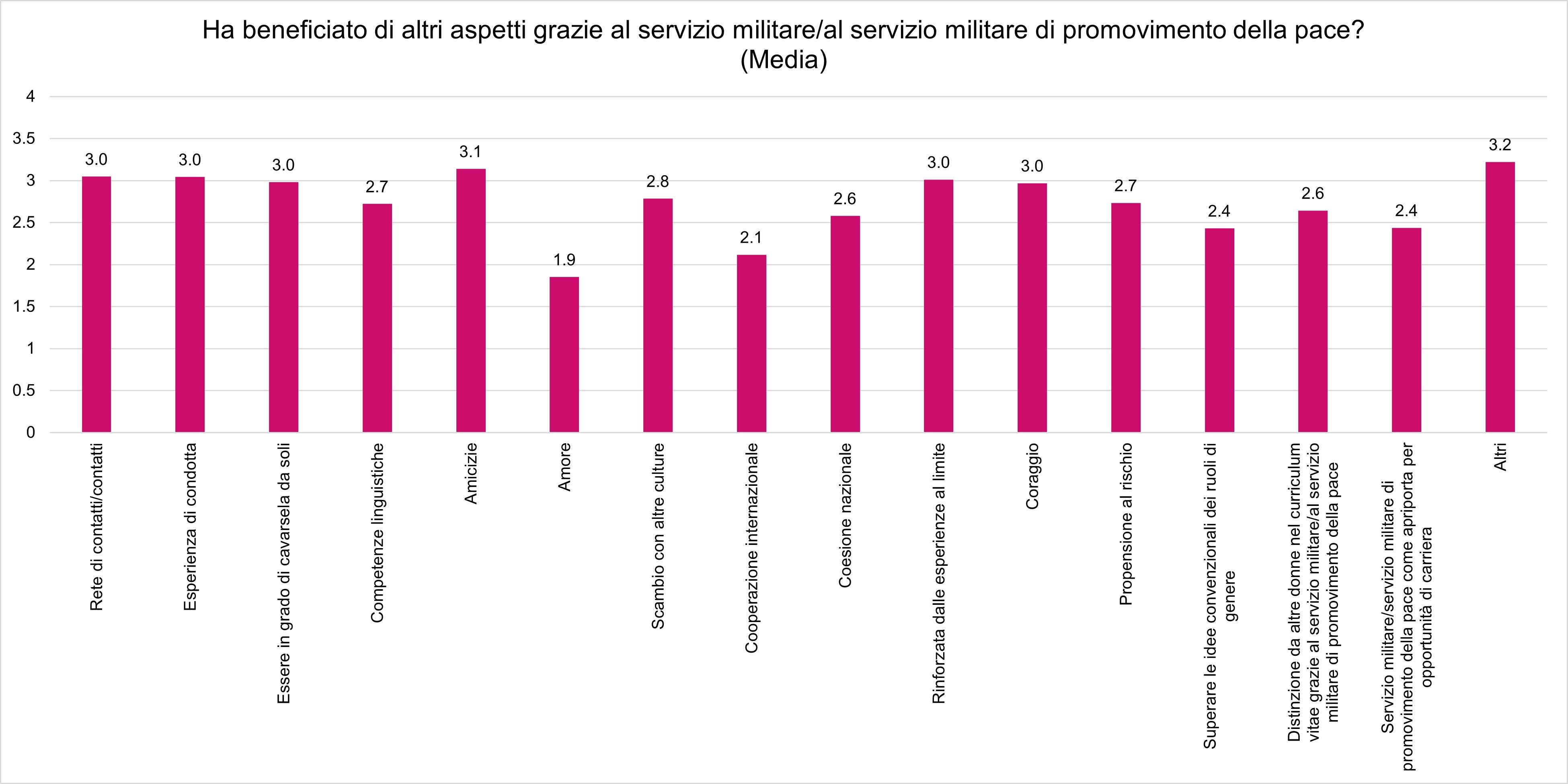 Gli ulteriori aspetti di cui le partecipanti hanno potuto beneficiare durante il loro servizio militare/servizio militare di promovimento della pace presentano delle differenze nelle medie dei valori. Questi si collocano sempre nell'intervallo tra 2 (approfittato parzialmente) e 3 (approfittato abbastanza) su una scala da 1 a 4 (non approfittato; approfittato molto) (cfr. Figura 5). Anche in questo caso, un'analisi più attenta della distribuzione mostra che gli aspetti sono stati valutati in modo diverso (cfr. Figura 6).