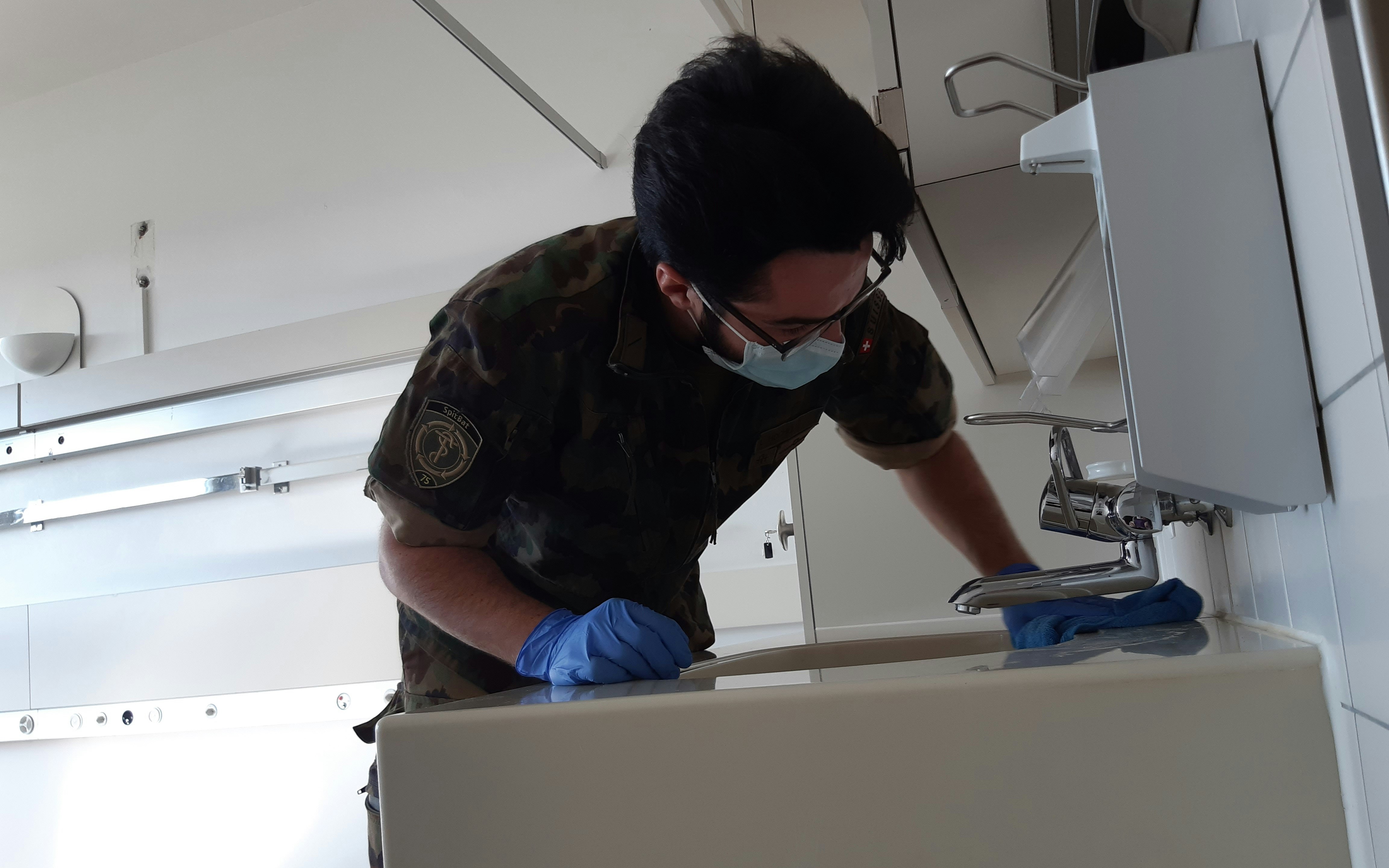 Da ieri, i militari del battaglione ospedale 75 sono impegnati con la pulizia e la disinfezione delle corsie del vecchio stabile. Quando sarà di nuovo operativo, anche il personale militare assisterà la sua gestione. A partire dal 27 marzo 2020, 10 militari del battaglione d'ospedale forniranno supporto.