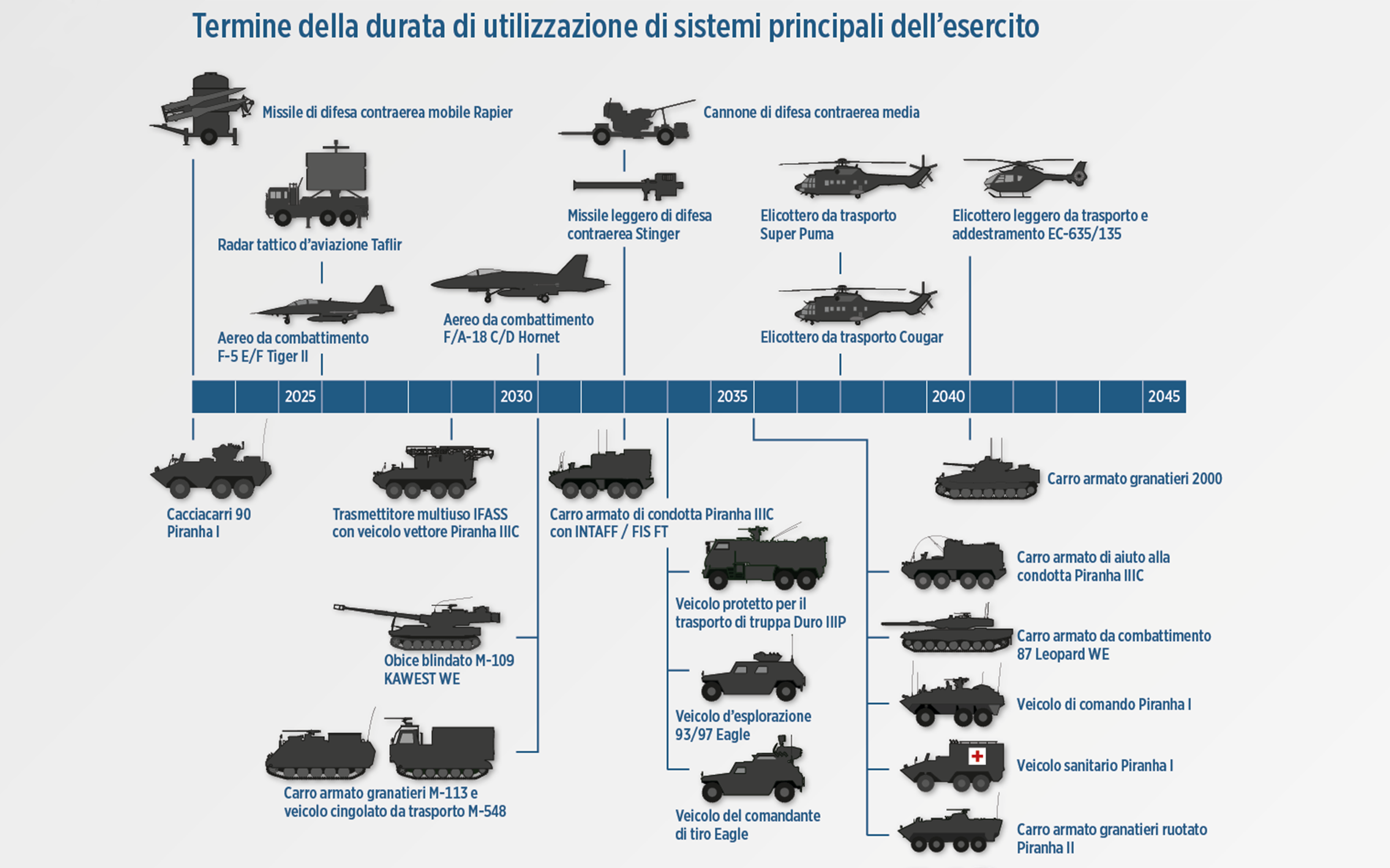 L’ammodernamento e il rinnovo dell’esercito costeranno più di 40 miliardi di franchi, finanziati con il budget ordinario dell’esercito. In questi costi sono compresi i nuovi aerei da combattimento «F-35» e il nuovo sistema di difesa terra-aria a lunga gittata «Patriot». Con questi due sistemi l’esercito ha cominciato a rafforzare a lungo termine la sua capacità di difesa. Tuttavia, nei prossimi venti anni dovrà sostituire in totale 24 sistemi principali che hanno raggiunto la fine della loro durata di utilizzo (si veda il grafico).