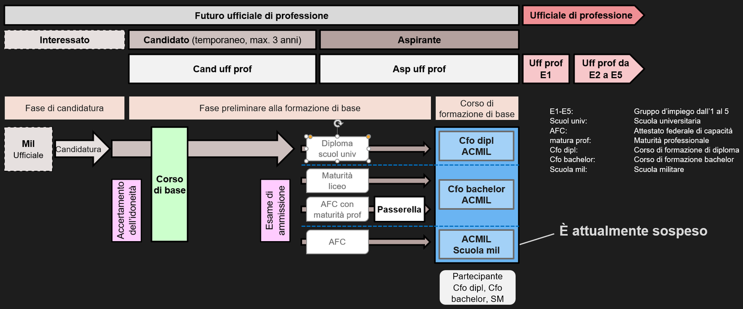 Due diversi corsi di formazione di base, a seconda della formazione precedente (civile e professionale), possono portare al diploma di ufficiale di carriera federale.