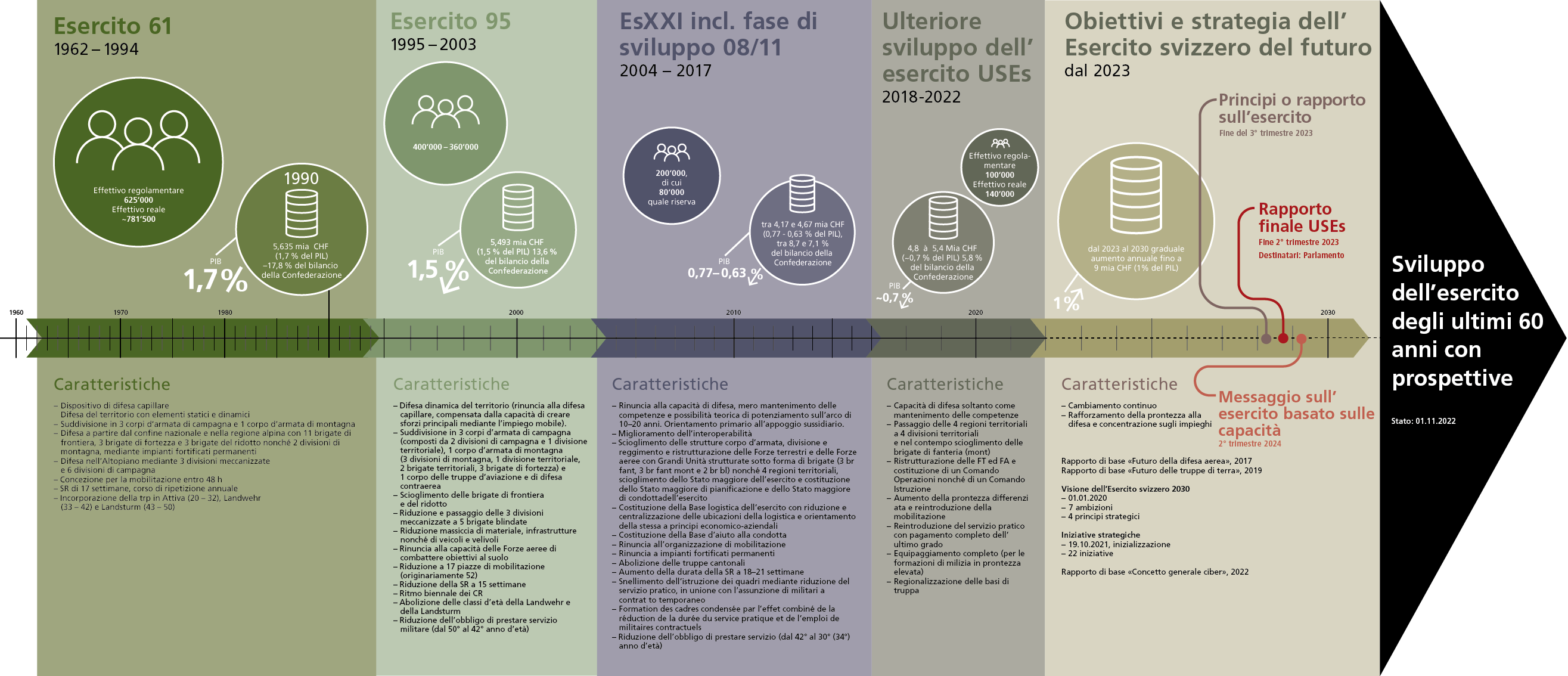 Vent’anni fa la situazione in materia di politica di sicurezza a livello internazionale era relativamente calma. Ciò ha indotto gli ambienti politici svizzeri a sottoporre l’esercito a costanti riforme. Il budget è stato ridimensionato, l’effettivo regolamentare è stato ridotto a 100 000 militari, la capacità militare per il mantenimento delle competenze è stata limitata, il compito fondamentale è stato orientato maggiormente all’appoggio sussidiario alle autorità civili e in misura minore alla difesa contro attacchi armati. La riforma «Esercito XXI» era basata sulla possibilità di riequipaggiare l’esercito sull’arco di dieci anni a livello di materiale, personale e finanziario sino a ristabilire la capacità di difesa qualora la situazione in materia di politica di sicurezza dovesse peggiorare. In termini militari una simile operazione di riarmo è denominata «potenziamento».