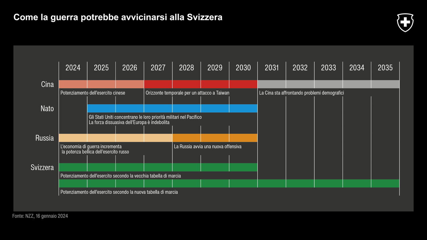 Il potenziale militare può essere osservato e richiede anni per essere sviluppato. Le intenzioni, invece, come dimostra anche la storia recente, possono cambiare rapidamente. Il potenziale militare nell’area circostante la Svizzera è aumentato e continua a crescere incessantemente. Diversi servizi informazioni europei, analisti e persino ministri della difesa esprimono la preoccupazione che il conflitto con la Russia possa subire un’ulteriore escalation. Spesso si parla di un’escalation a partire dal 2028.